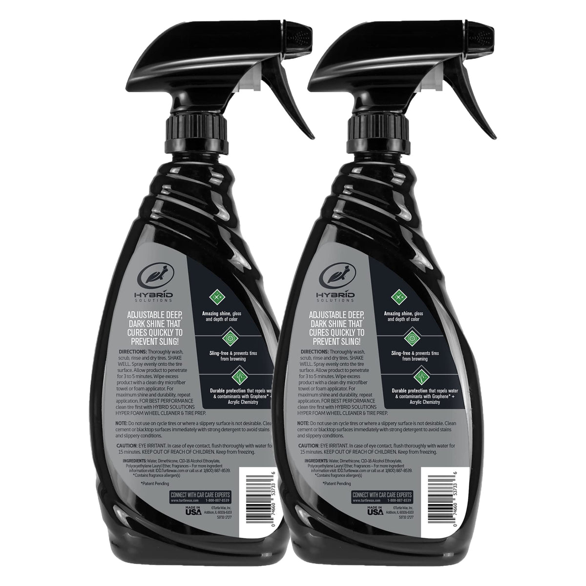 Hybrid Solutions Graphene Acrylic Tire Shine Spray Coating produces deep dark gloss. Graphene and Acrylic infusion give this Hybrid Solutions formula incredible durability, repellency and UV protection. It also delivers a sling-free durable and washable coating that repels water and contaminants for months. The benefits of Graphene include incredible gloss, slickness, water repellency, and chemical resistance, along with heat dissipation for increased UV protection. With the perfect blend of the latest technologies in car care, teamed with Turtle Waxs decades of experience, Hybrid Solutions is guaranteed to deliver unmatched results. Turtle Wax: Dedicated to the Drive.