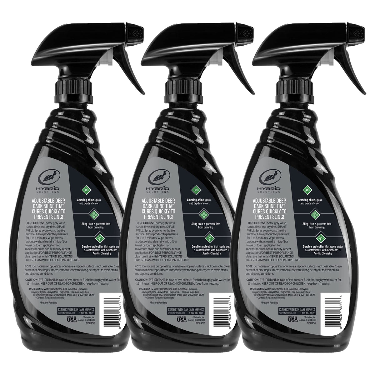 Hybrid Solutions Graphene Acrylic Tire Shine Spray Coating produces deep dark gloss. Graphene and Acrylic infusion give this Hybrid Solutions formula incredible durability, repellency and UV protection. It also delivers a sling-free durable and washable coating that repels water and contaminants for months. The benefits of Graphene include incredible gloss, slickness, water repellency, and chemical resistance, along with heat dissipation for increased UV protection. With the perfect blend of the latest technologies in car care, teamed with Turtle Waxs decades of experience, Hybrid Solutions is guaranteed to deliver unmatched results. Turtle Wax: Dedicated to the Drive.