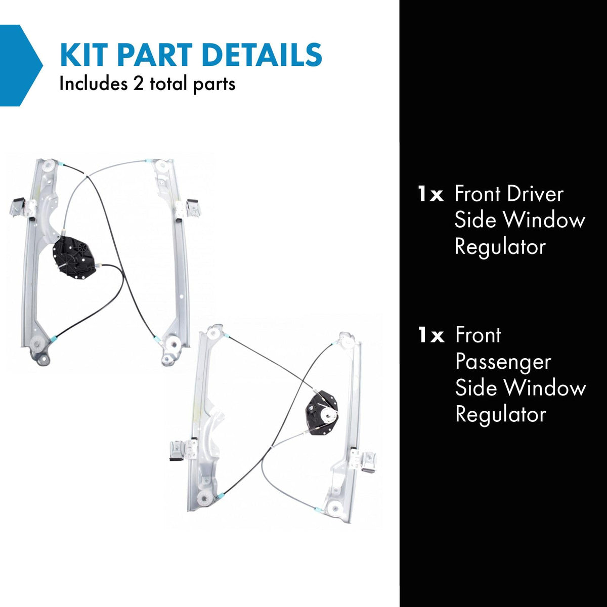2 Piece Power Window Regulator SetKit Includes(1) Front Driver Side Window Regulator(1) Front Passenger Side Window RegulatorFitmentCompatible with: 2014-18 Chevrolet Silverado 1500 Front Driver & Passenger SideCompatible with: 2014-18 GMC Sierra 1500 Front Driver & Passenger SideCompatible with: 2015-20 Chevrolet Tahoe Front Driver & Passenger SideCompatible with: 2015-19 Chevrolet Silverado 2500 HD Front Driver & Passenger SideCompatible with: 2015-20 Chevrolet Suburban Front Driver & Passenger SideCompatible with: 2015-20 GMC Yukon Front Driver & Passenger SideCompatible with: 2015-19 GMC Sierra 2500 HD Front Driver & Passenger SideCompatible with: 2015-20 GMC Yukon XL Front Driver & Passenger SideCompatible with: 2015-19 Chevrolet Silverado 3500 HD Front Driver & Passenger SideCompatible with: 2015-20 Cadillac Escalade Front Driver & Passenger SideCompatible with: 2015-19 GMC Sierra 3500 HD Front Driver & Passenger SideCompatible with: 2015-20 Cadillac Escalade ESV Front Driver & Passenger SideCompatible with: 2019 Chevrolet Silverado 1500 Legacy Front Driver & Passenger SideCompatible with: 2019 GMC Sierra 1500 Limited Front Driver & Passenger SideCompatible with: 2016-19 Chevrolet Suburban 3500 HD Front Driver & Passenger SideProduct AttributesQuantity: 2 PieceOperation: PowerProduct Features Heavy Duty: Engineered to perform under harsh conditions Improved Design: Upgraded components and materials to prevent premature failure Installer-Friendly: Application Specific DesignReference NumbersACI: 382044Chevrolet: 23453653, 23453654Dorman - OE Solutions: 751-724Echlin: WLA4006General Motors: 23118067, 23422490, 23453653, 84621036
