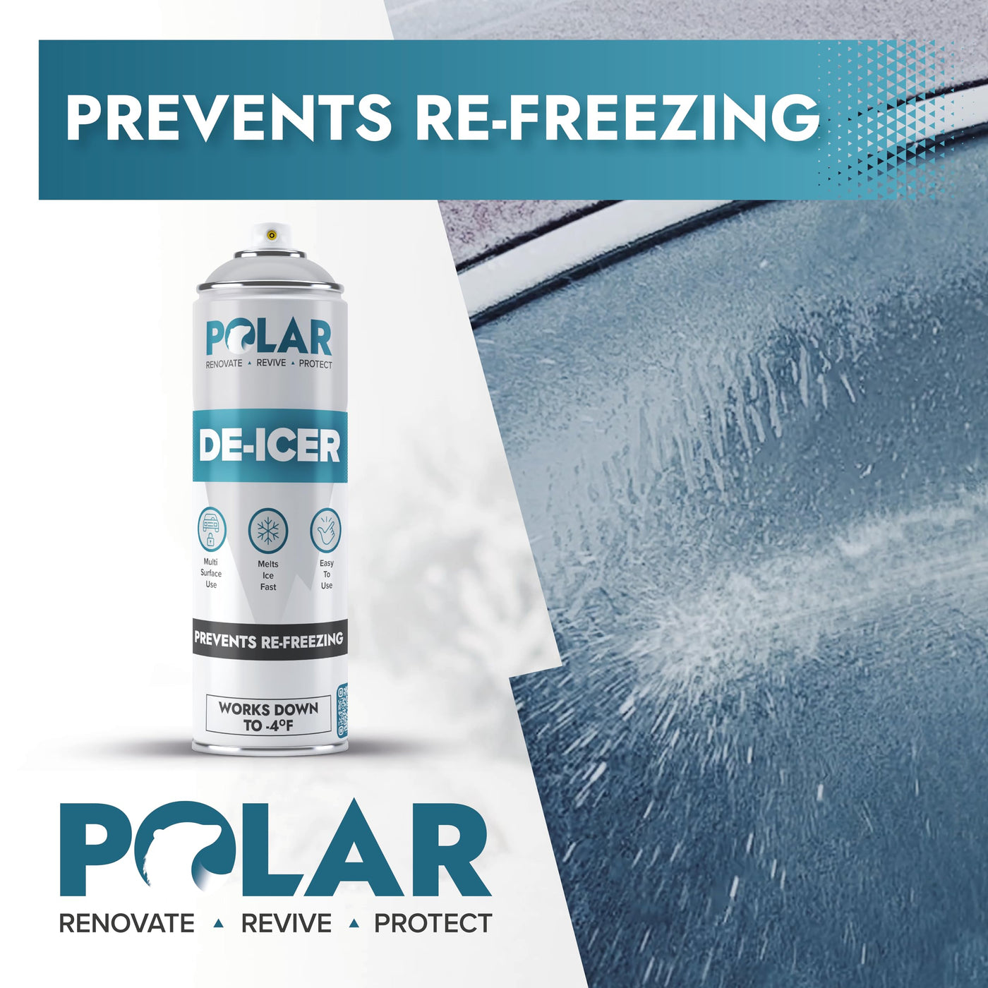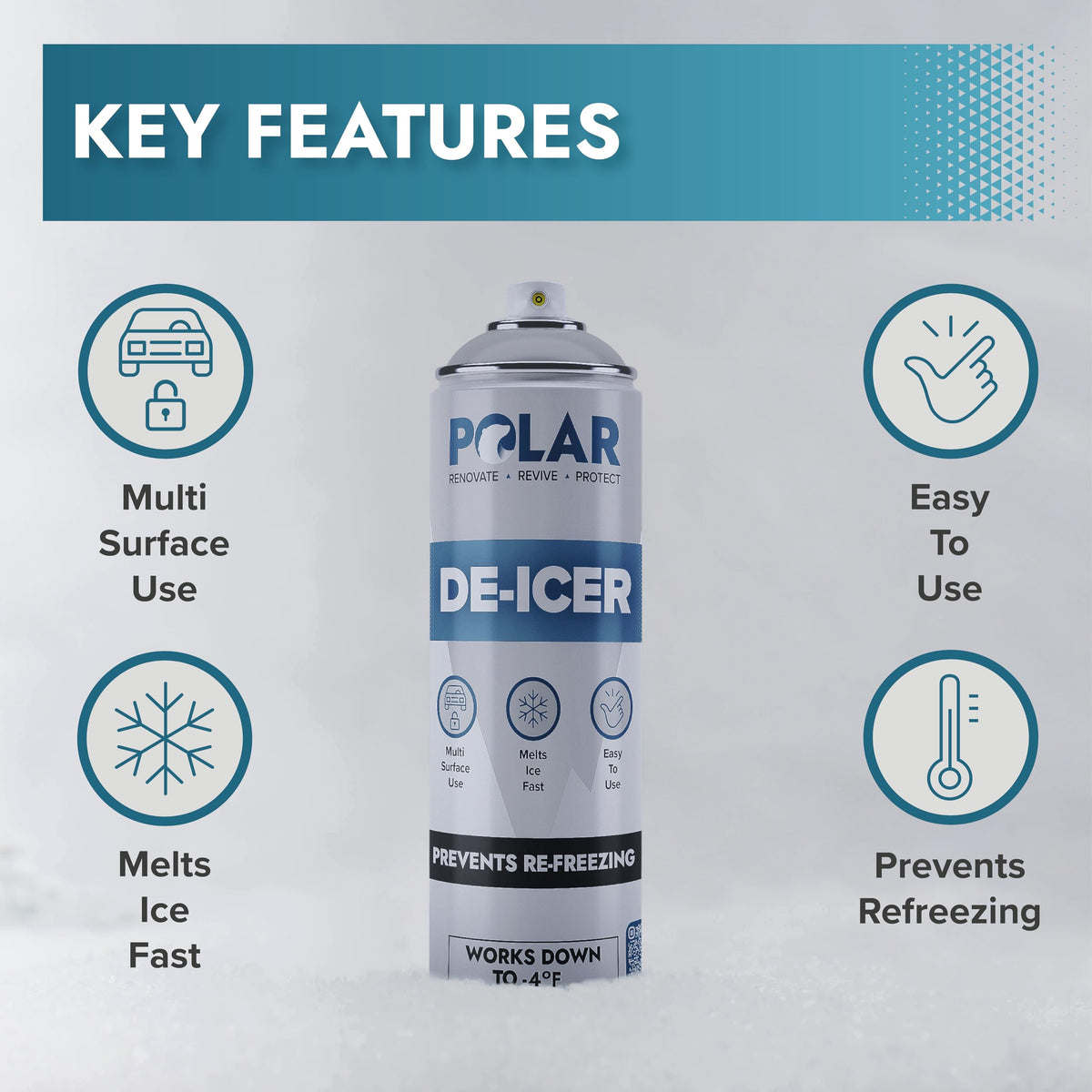 Polar De-Icer Spray is your ultimate solution for tackling ice, snow, slush, and sleet with ease and efficiency. Designed for rapid results, this car windshield deicer spray clears your car windscreen, van windows, and other frosty surfaces swiftly, ensuring a clear view and enhancing safety during challenging winter weather. Its potent formula begins working immediately upon contact, melting away ice at temperatures as low as -4F, which reduces the time spent scraping and helps you get back on the road quickly. The car window deicer sprays effectiveness extends beyond automotive use; it's also ideal for hard surfaces prone to freezing, such as locks, hinges, and gates, making it a perfect de-icer spray for car door locks. The product's user-friendly design makes application straightforward: first, remove any loose ice or snow with a scraper, then shake the can well before use. Spray directly onto the surface from about 12 inches away, watch as frost and ice dissolve, and finally, dry the area with a cloth to avoid streaks. The 17 oz can covers up to 32 sq ft, ensuring that you can tackle both small and large surfaces efficiently, making it a practical choice for maintaining accessibility during harsh weather. With a quick-drying formula helps reduce dangerous refreeze, Polar De-Icer ensures that surfaces remain clear and functional for longer. This versatile spray not only saves you valuable time and effort but also contributes to a safer driving experience by reducing the risk of accidents caused by obscured visibility. Whether youre preparing your vehicle for a journey or dealing with stubborn frost on home surfaces, De-Icer Spray provides reliable performance and convenience, proving to be an indispensable tool in your winter weather arsenal. Ideal for both professional and personal use, this de-icer spray offers exceptional results and peace of mind during the most challenging weather conditions, making winter preparation effortless and effective.