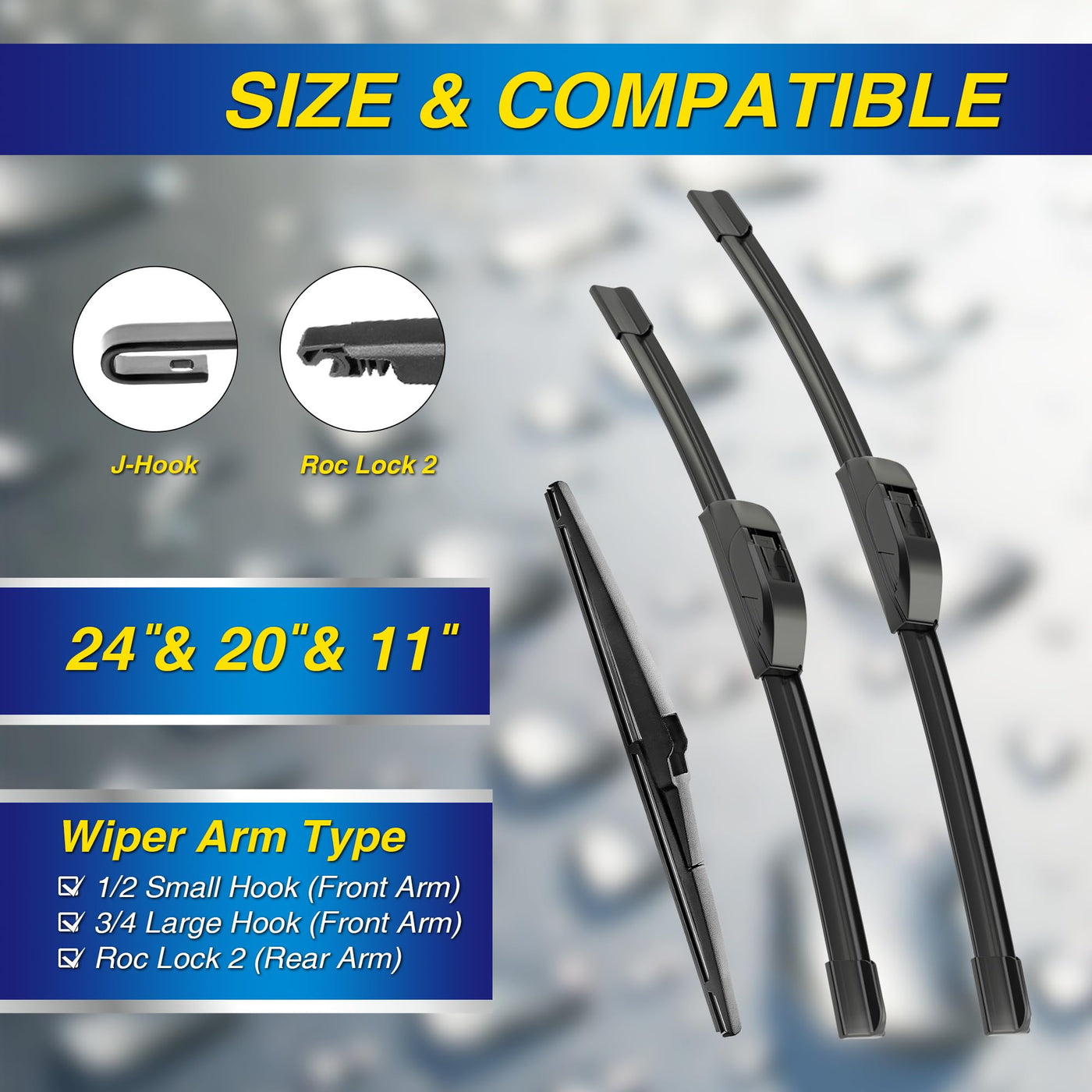 Q: How do I install the windshield wipers?A: Installation is quick and easy. The wipers are suitable for J-hook wiper arms and can be installed in just 10 seconds without any special tools.
