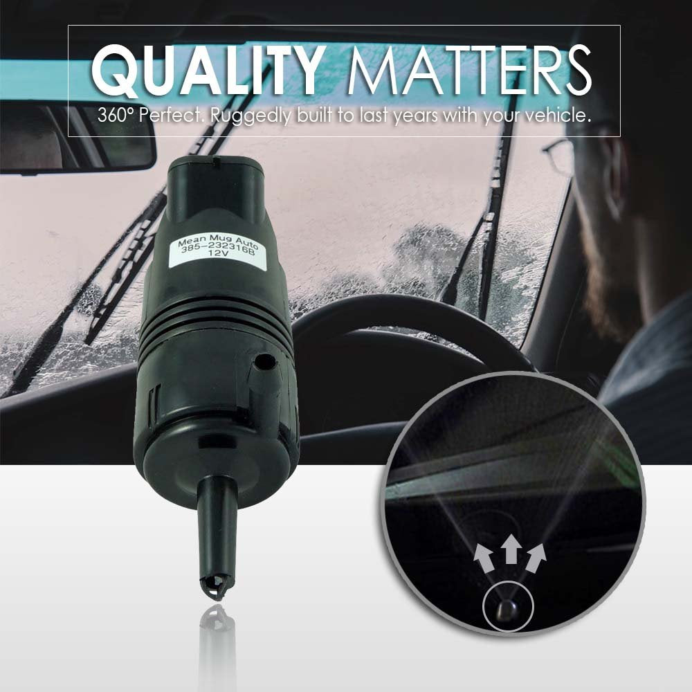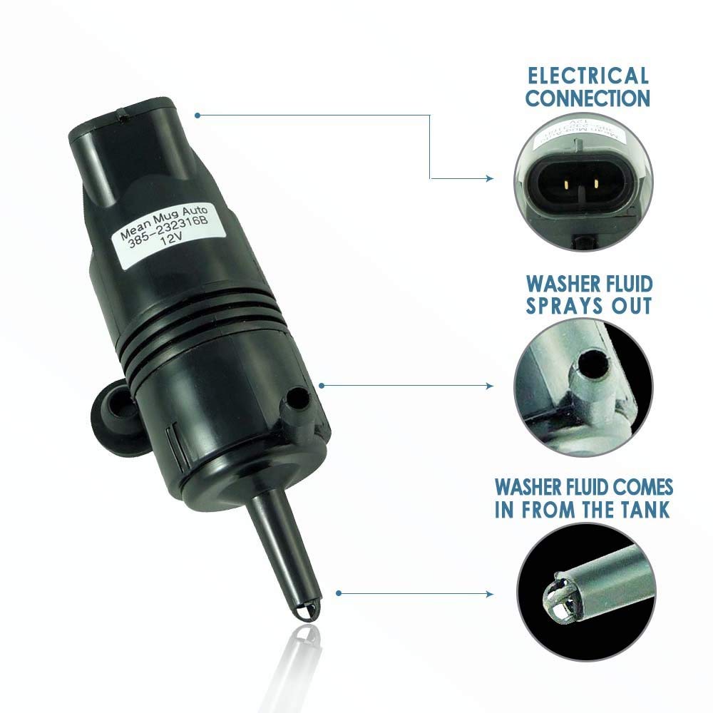 • Q: What features make the Mean Mug Auto Washer Pump reliable? A: This windshield washer pump is built for efficiency and durability. It effectively pulls clean washer fluid from the reservoir and pushes it through the nozzle to ensure a clear view. Made with rugged materials, it is designed to last for years, providing peace of mind that you won't need to frequently replace it.
