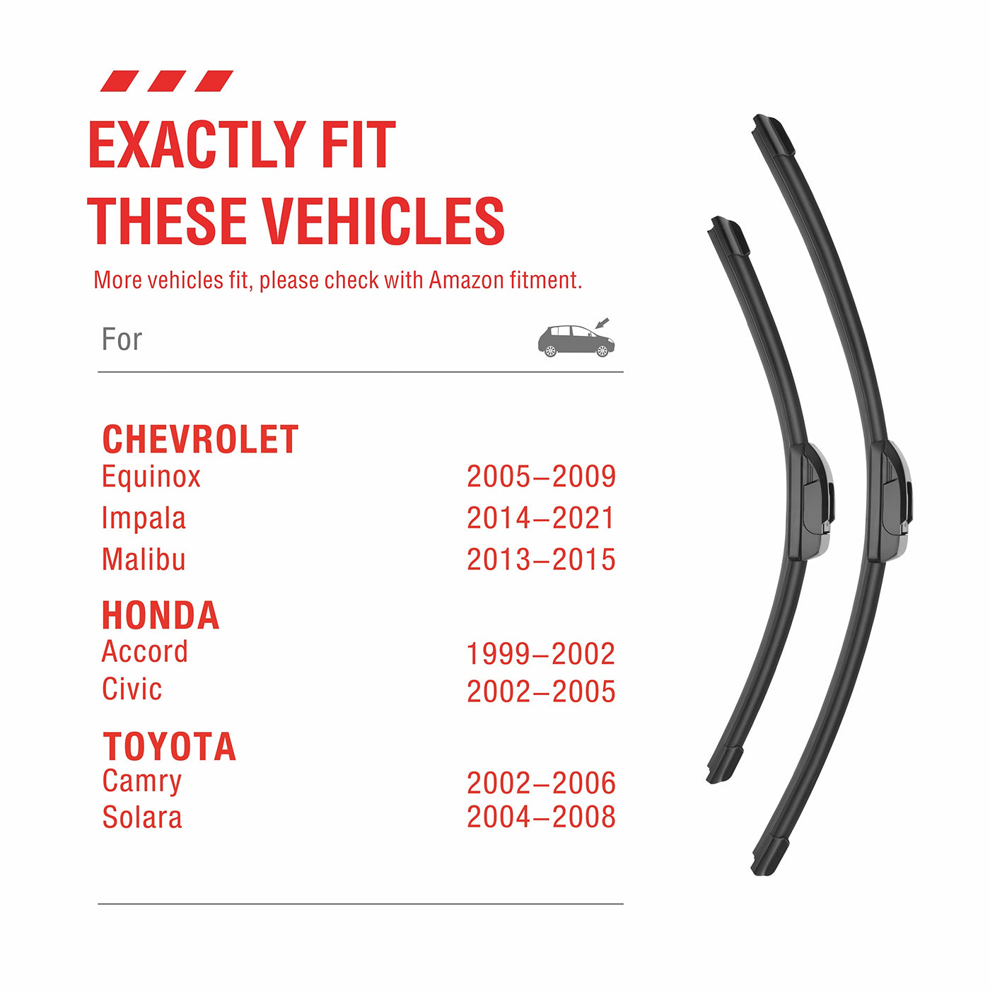 Q: What car models are compatible with these windshield wiper blades?A: These OEM quality windshield wiper blades are designed to fit several car models, including Chevrolet Malibu (2015-2013), Honda Civic (2005-2002), and Toyota Camry (2006-2002). Please refer to the product description for a complete list of compatible vehicles.