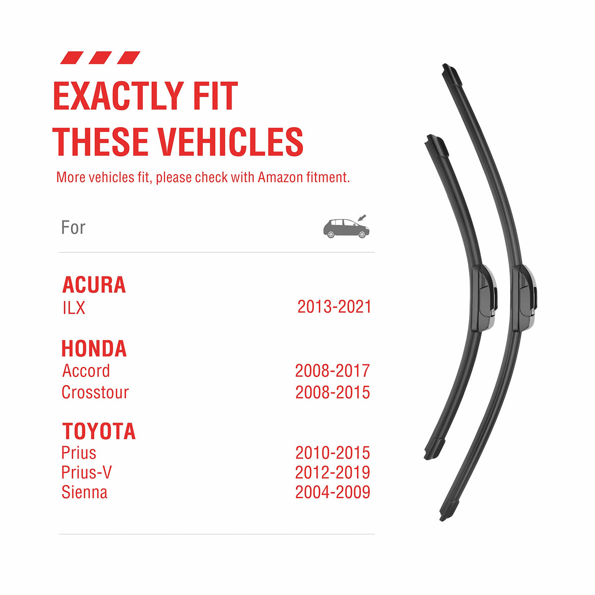 Berg Regen Rear Windshield Wiper Arm And Blades Implement The Quality And Production Standard 30% Higher Than Oem. Toyota Sienna Wiper Series Exactly Fit For: Acura Ilx 2013-2021 Honda Accord 2008-2016 Honda Crosstour 2010-2015 Toyota Prius V 2012-2019 Toyota Sienna 2004-2010 Oe No. Replacement: Windshield Wiper Blade: 26 And 19 Inch / 650 And 475 Mm Product Features: Flexible To Touch The Full Area Same Size (26'' 19'') As Genuine Oe Wiper Durable For 1 Full Year Silence Wiping Technology, No Noise&Nbsp; Package Includes: 2X Windshield Wiper Blades 1X Installation Instruction&Nbsp; Note: Please Make Sure Your Car Meet The Car Models Listed In Up; Please Remove The Red Rubber Protector Before Use; If You Have Any Question Or Problem, Please Feel Free To Contact Us, We Promise To Try Our Best To Solve Any Problem; Your Satisfaction Is Our Top Concern. Please Contact Us To Solve Any Issue Before Leaving Neutral Or Negative Feedback.&Nbsp; Guarantee: All Berg Regen Rear Wipers Can Be Return In 200 Days With No Reason, With 12 Months Life Warranty, You Can Contact Our 7X24 Hours Service Team At Any Time. &Nbsp;