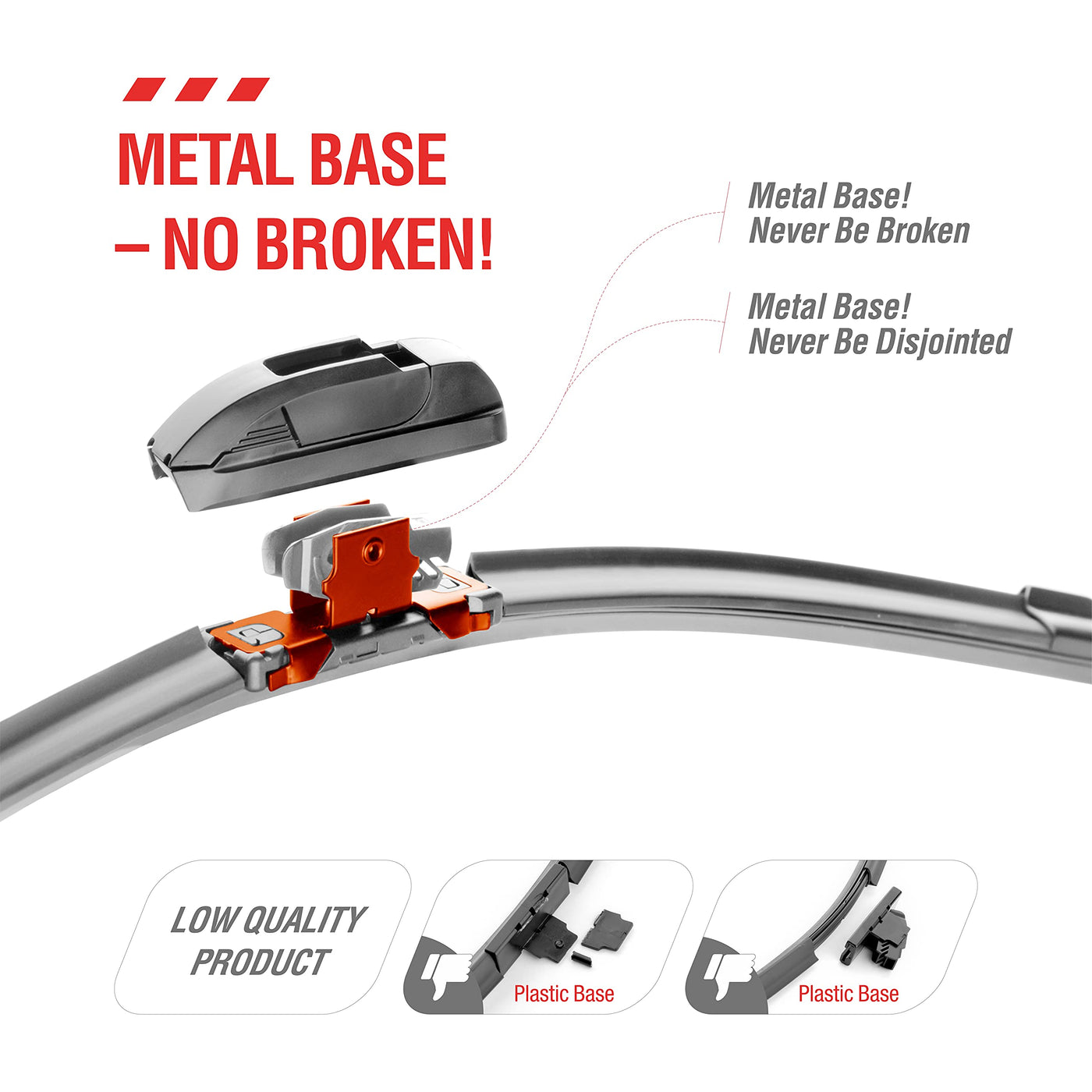 Q: What materials are these wiper blades made of?A: These windshield wiper blades are constructed with a metal base, providing enhanced stability and durability during use, ensuring long-lasting performance.