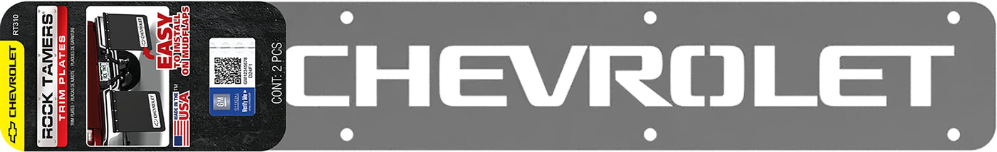 Rock Tamers Chevrolet Trim Plates Are An Officially Licensed Add-On Mudflap Accessory Item, Allowing Customization To Your Mudflap To Show Off Your Chevrolet Pride. Includes 2 Stainless Steel Trim Plates With Straight Forward Installation Instructions. Rock Tamers Mudflaps Sold Separately. Rock Tamers Are The Premiere Adjustable And Removable Mudflap System Designed To Provide The Ultimate Protection For Your Towables From Damage Caused By Rocks And Road Debris And The Perfect Solution For Consumers Who Want The Utility Aspect Of Mudflaps And To Maintain Their Vehicles Stylish And Attractive Appearance.