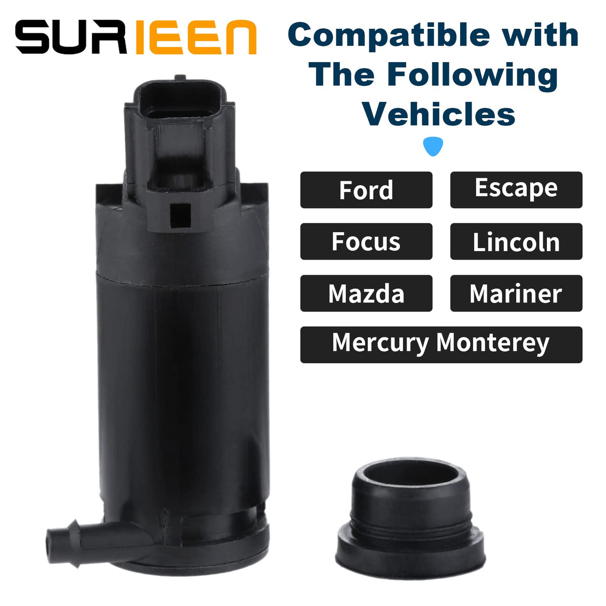 Q: What vehicles are compatible with the Windshield Washer Pump?A: The Windshield Washer Pump is compatible with various Ford models including the F-150, F-250, and F-350, as well as Ford Escape, Focus, and several Lincoln, Mazda, and Mercury vehicles. Check the full list of compatible models in the product description for specific years.