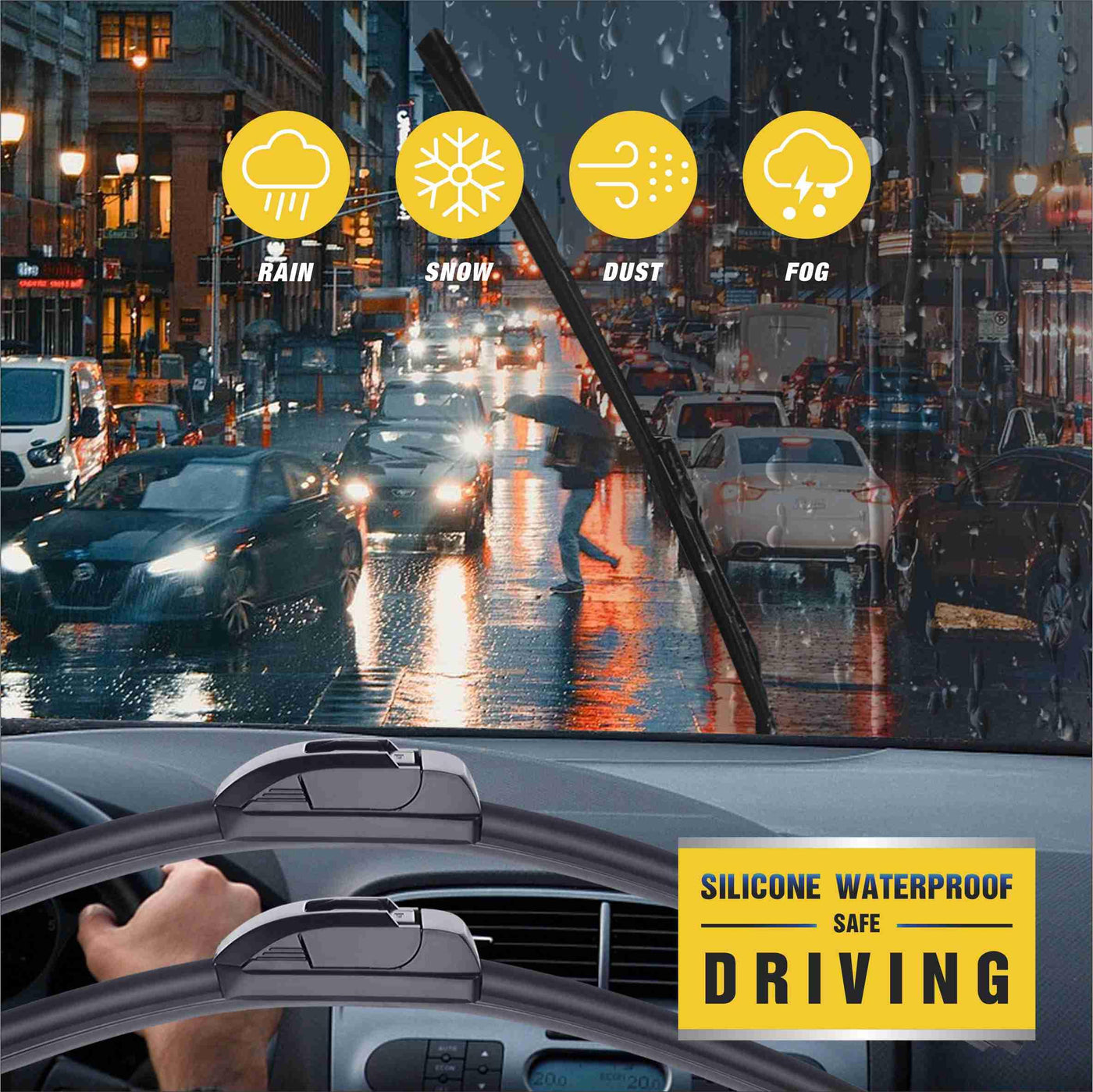 Q: Are these wiper blades effective in heavy rain or snow?A: Yes, the high-quality silicone material and robust metal base are designed to perform well in various weather conditions, including heavy rain and snow, ensuring clear visibility.