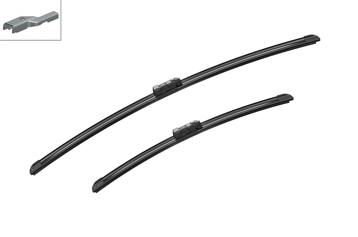Bosch AeroTwin's patented beam design contains no metal or plastic brackets, joints or hinges, offering an ideal technology upgrade for vehicles originally fitted with conventional wiper blades. The specially blended dual rubber compound with graphite coating removes even the smallest traces of water for exceptional all-weather visibility and smooth, quiet operation. Specific beam curvature for OE specialty wiper arm types, coupled with dual precision-tensioned steel springs, ensures uniform pressure along the entire blade length for crystal clear visibility. Built-in asymmetrical wind spoiler uses air flow to increase blade-to-windshield contact - for consistent performance at highway speeds. Wind spoiler also serves to protect the tension springs from damage by severe weather elements for increased durability and long life. Pre-assembled OE style adapter provides OE fit and function for simple, easy installation on specific vehicles. Set of 2. Note: AeroTwin wiper blades are designed to fit vehicles with specific wiper arm connnection types - they are not universal fit wiper blades. Please verify specific vehicle fitment details with fit checker above.