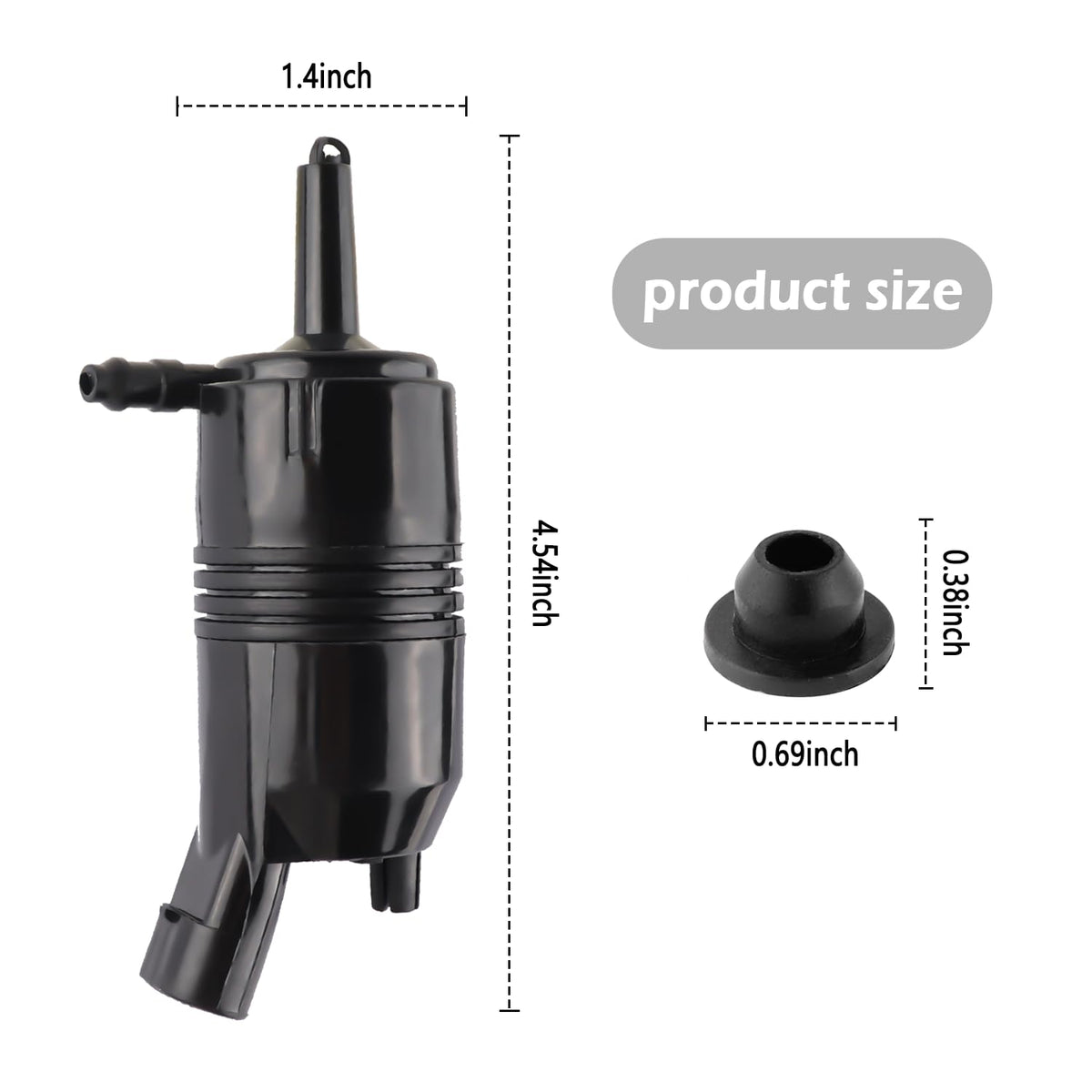 Q: What are the specifications of the windshield washer pump?A: The Car Windshield Washer Pump operates at 12V with a flow rate of 1950ml/min and a load current of less than 4.5A. It features a single hole water outlet and dimensions of 4.5x1.4 inches, making it a compact and efficient option for your vehicle's windshield cleaning system.