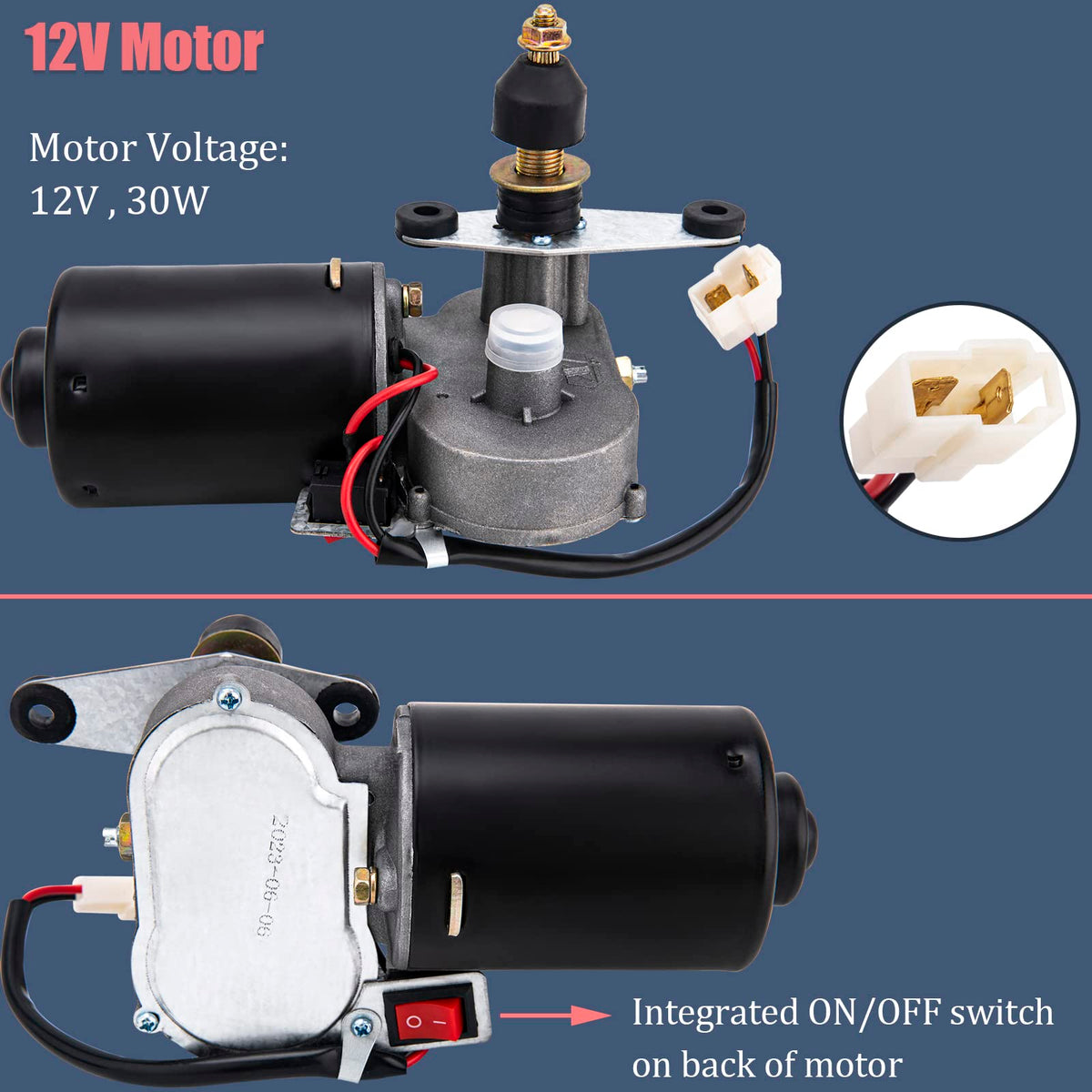 Q: What are the specifications of the electric motor in this wiper kit?A: The electric motor in this windshield wiper kit operates at 12V and has a power rating of 30W. It features an integrated ON/OFF switch located on the back of the motor for easy operation.