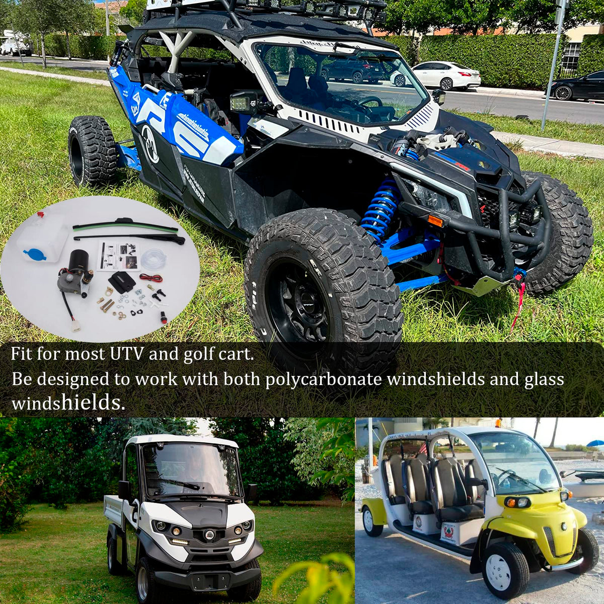 The Universal Utv Windshield Wiper Kit Fit For Most Utv And Golf Cart. The Electric Utv Windshield Wiper Kit Is Designed To Work With Both Polycarbonate Windshields And Glass Windshields. The Windshield Wiper Kit Features A 90-Degree Sweep For Effective Coverage.Additionally,If You Prefer A Dual Wiper System, You Can Wire The Wipers Together In Tandem Using An External Switch. Product Name: Utv Windshield Wiper Kit Electric Motor Specifications: Motor Voltage: 12V , 30W , Integrated On/Off Switch On Back Of Motor. Swing : 90 Degree Sweep. Windshield Wiper Specifications: Wiper Arm Size: 15.74 Inch Wiper Blade Size: 15.74 Inch Fitment: Compatible With Polaris Rzr/ Ranger / General/ 570/800/900/1000/ Xp Compatible With Maverick / X3/ Commander/ Defender Compatible With Kawasaki Mule /Teyrx Compatible With Honda Pioneer/ Talon Compatible With Rhino Compatible With Golf Cart Package Include:(As Main Photo Shows) 1 X Wiper Arm 1 X Wiper Blade 1 X 12V Motor(90 Degree Wipe Sweep / Angle) 1 X Connection Wire With Plug 1 Set Washer Pump Bottle Kit