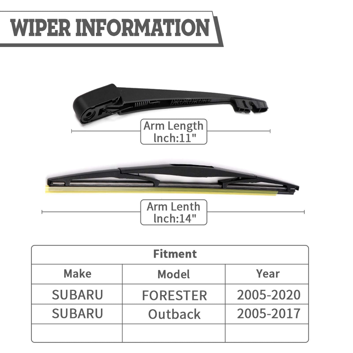 Easy Install And Removal: Including Remove Tools, Nut And Wrench. Please See The Vedio Follow The Installation Instructions Fitment: Fit For Subaru Outback 2005-2014 Fit For Subaru Tribeca 2008-2014 Fit For Subaru Impreza 2005-2008 Fit For Subaru Forester 2002-2003, 2006-2016 Fit For Subaru Legacy 2006-2009 Specification: Rear Wiper Arm Length:292Mm Rear Wiper Blade Length:360Mm Repaces Oem Part Number:86532Ag09A 86532Ag09B 86532Ag09C 86532Sa070 86542Xa09A Packing Includes: 1 Rear Wiper Arm 1 Rear Wiper Blade 1 Rear Wiper Cover 1 Rear Wiper Nut 1 Install Wrench Product Features: Install: Includes Nut And Tools Clear: Used Nature Rubber Durability:70%Pbt +30% Fuberglass Weather Resistant: 304H Steel Note: * Please Remove The Green Protector Before Use * Please Make Sure Your Car Meet The Following Models Before Place Order * Please Follow The Instructions Vedio To Install * Kindly Find The Image Description Make Sure All Plastic/Metal Is Removed From The Wiper Motor Shaft Or The New Arm Will Not Fit!!