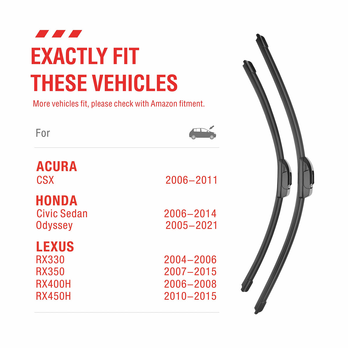 Q: What vehicles are compatible with these windshield wiper blades?A: These OEM quality windshield wiper blades are designed to fit a variety of vehicles including the Honda Odyssey (2005-2020), Lexus RX350 (2004-2015), Lexus RX400h (2006-2015), Acura CSX (2006-2011), and Toyota Venza (2009-2014).