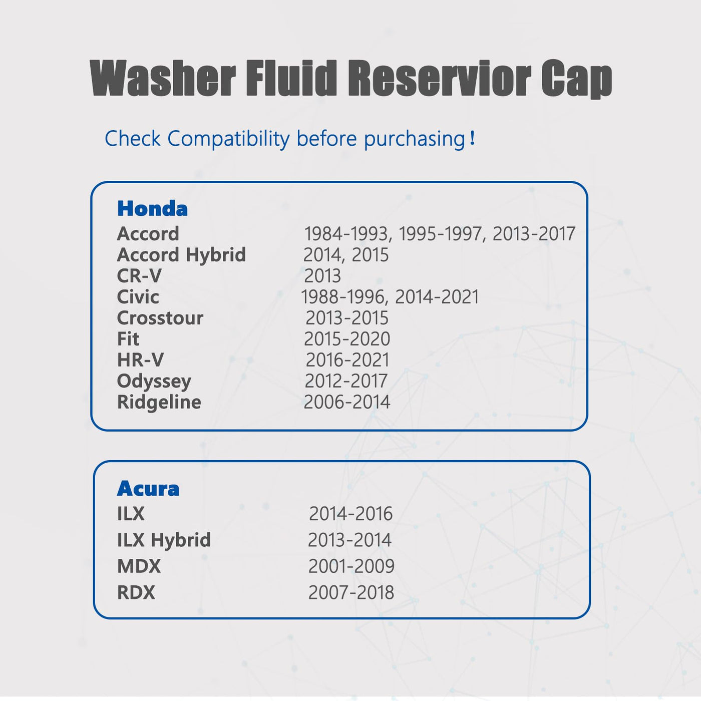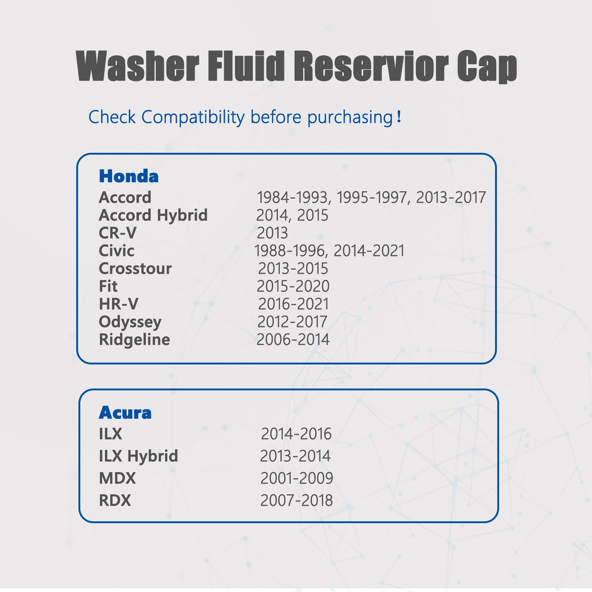 Q: Is this washer fluid cap compatible with my Acura or Honda vehicle?A: Yes, the OTTOPO Washer Fluid Cap is compatible with various Acura and Honda models, including Acura MDX (2001-2009), ILX (2014-2016), RDX (2007-2018), and Honda Civic (1988-1996, 2014-2021), Odyssey (2012-2017), and several others. Please check the full compatibility list before purchasing.