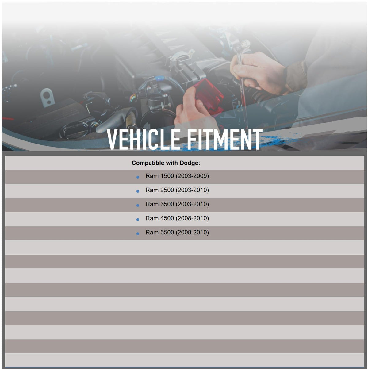 POSITION: Front Wiper Motor FEATURE 1: Includes Crank Arm This list is a sample of all the compatible cars for this part. Make sure this product fits your car by using the part finder above. COMPATIBLE WITH DODGE: Ram 5500 (08-10) Ram 4500 (08-10) Ram 3500 (03-10) Ram 2500 (03-10) Ram 1500 (03-09) Replaces Part Numbers: 40-3025, ?55077098A, 55077098AC, 55077098AC 55077098AF 55077098AG 55077098AH, 55077098AF, 55077098AG, 55077098AH, 55077098AJ, 55077098AK, 853025, 85-3025, PPWPM3025, WPM3025, 403025