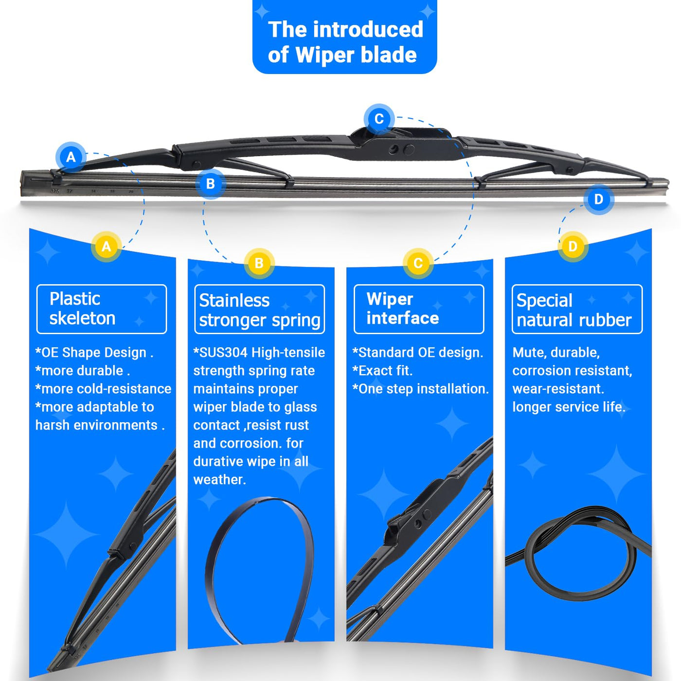Q: What materials are used in the construction of the RAINTOK wiper blades?A: RAINTOK wiper blades are made with high-quality natural rubber for optimal wiping performance, a zinc alloy base for stability, and an exact fit memory steel spring to ensure even contact with the windshield.