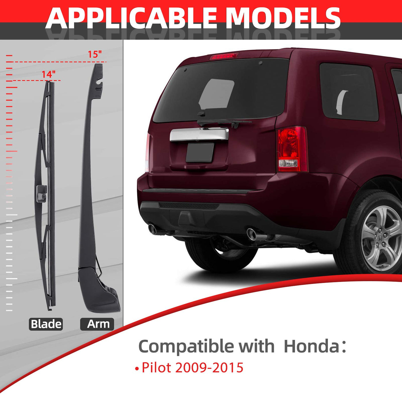 Q: Is this wiper arm blade set compatible with my 2009 Honda Pilot?A: Yes, this Replacement for Honda Pilot 2009-2015 Rear Windshield Wiper Arm Blade Set is specifically designed to fit all models of the Honda Pilot manufactured between 2009 and 2015.