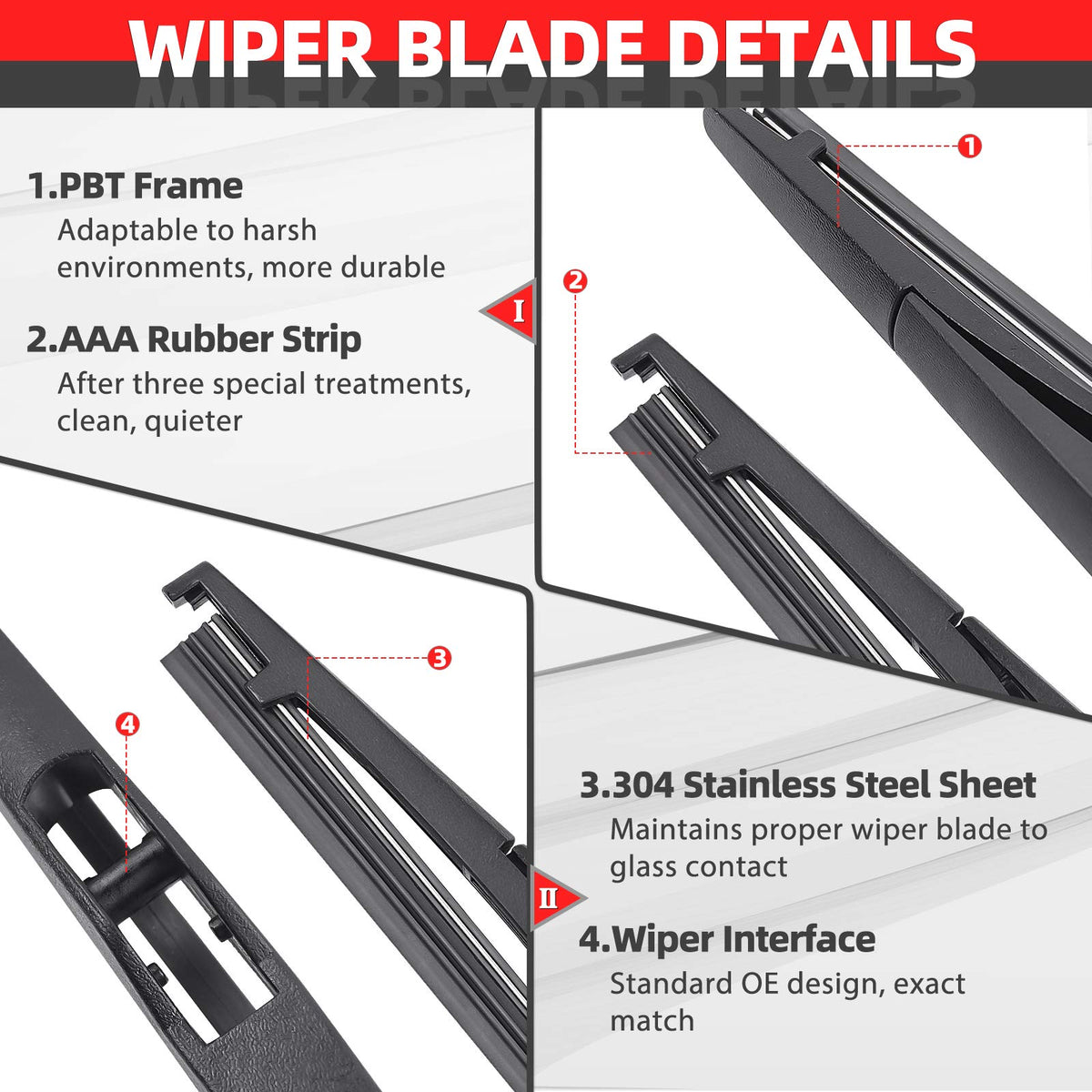Q: What advantages does this wiper set have over other similar products?A: This OTUAYAUTO rear wiper set features a stainless design that offers wear and extreme weather resistance, improving the service life by 80% compared to other products on the market.