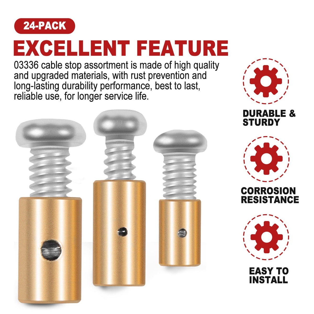 Q: How durable are the cable stops in this assortment?A: The cable stops are made of high-quality materials that offer rust prevention and long-lasting durability, ensuring reliable performance for an extended service life.