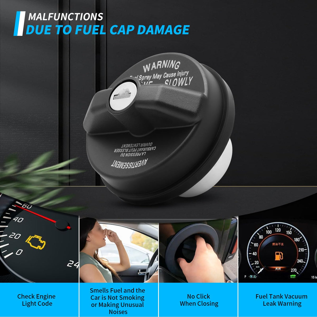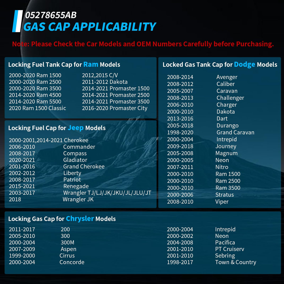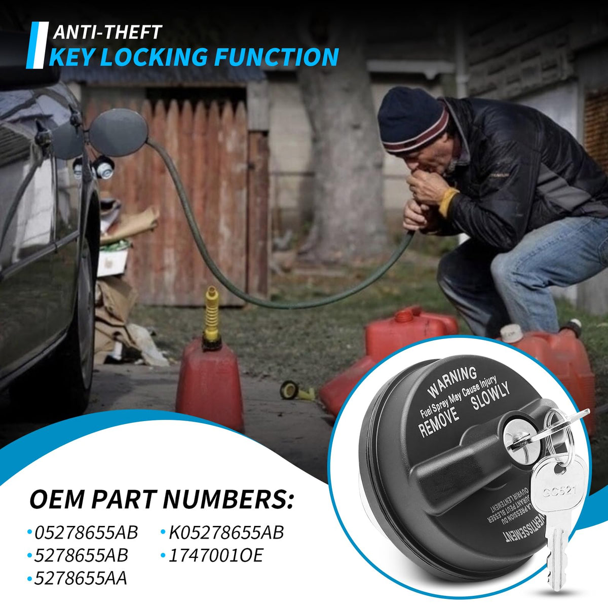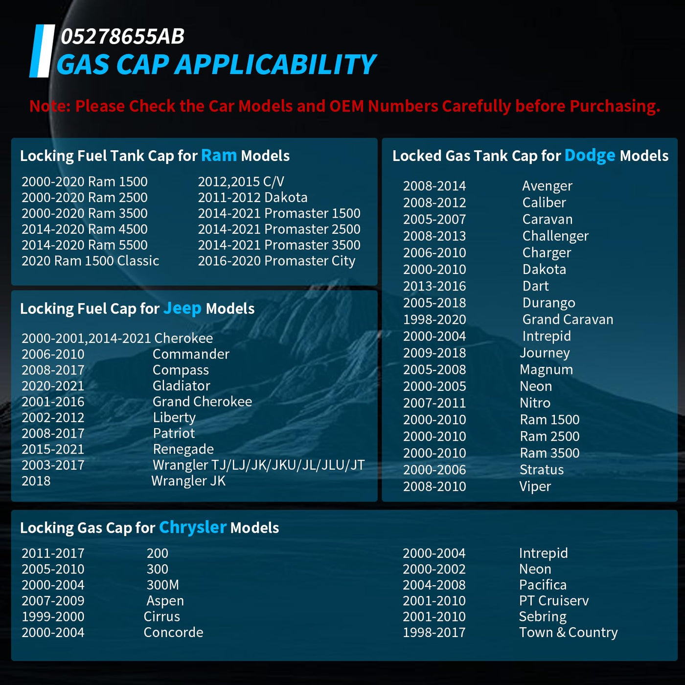 Locked Gas Cap OEM Part Numbers: 05278655AB 5278655AB 5278655AA K05278655AB 1747001OE Fitments: Locking Gas Cap Replacement Fit for Chrysler 2011-2017 Chrysler 200 2005-2010 Chrysler 300 2000-2004 Chrysler 300M 2007-2009 Chrysler Aspen 1999-2000 Chrysler Cirrus 2000-2004 Chrysler Concorde 2000-2004 Chrysler Intrepid 2000-2002 Chrysler Neon 2004-2008 Chrysler Pacifica 2001-2010 Chrysler PT Cruiserv 2001-2010 Chrysler Sebring 1998-2017 Chrysler Town & Country Fuel Cap with Lock Replace for Dodge 2008-2014 Dodge Avenger 2008-2012 Dodge Caliber 2005-2007 Dodge Caravan 2008-2013 Dodge Challenger 2006-2010 Dodge Charger 2000-2010 Dodge Dakota 2013-2016 Dodge Dart 2005-2018 Dodge Durango 1998-2020 Dodge Grand Caravan 2000-2004 Dodge Intrepid 2009-2018 Dodge Journey 2005-2008 Dodge Magnum 2000-2005 Dodge Neon 2007-2011 Dodge Nitro 2000-2010 Dodge Ram 1500 2000-2010 Dodge Ram 2500 2000-2010 Dodge Ram 3500 2000-2006 Dodge Stratus 2008-2010 Dodge Viper Fuel Tank Cap with Keys fit for Jeep 2000-2001 & 2014-2021 Jeep Cherokee 2006-2010 Jeep Commander 2008-2017 Jeep Compass 2020-2021 Jeep Gladiator 2001-2016 Jeep Grand Cherokee 2002-2012 Jeep Liberty 2008-2017 Jeep Patriot 2015-2021 Jeep Renegade 2003-2017 Jeep Wrangler TJ/LJ/JK/JKU/JL/JLU/JT 2018 Jeep Wrangler JK Locked Gas Tank Caps Fit for Ram 2000-2020 Ram 1500 2000-2020 Ram 2500 2000-2020 Ram 3500 2014-2020 Ram 4500 2014-2020 Ram 5500 2020 Ram 1500 Classic 2012 & 2015 Ram C/V 2011-2012 Ram Dakota 2014-2021 Ram Promaster 1500 2014-2021 Ram Promaster 2500 2014-2021 Ram Promaster 3500 2016-2020 Ram Promaster City Faults Caused by Gas Caps OEM Damage: - Check Engine Light Code - Fuel Tank Vacuum Leak Warning - No Click When Closing - Smells Fuel and the Car is Not Smoking or Making Unusual Noises Functions of Fuel Tank Gas Cap: - Key Unlocking and Locking Function to Prevent Oil Theft - Keep the Vehicle's Fuel Tank Closed to Protect Vehicle Occupants - Prevent Fuel Loss, Thereby Reducing the Number of Refuelings - Avoid Substandard Automobile Exhaust Emissions and Protect the Environment