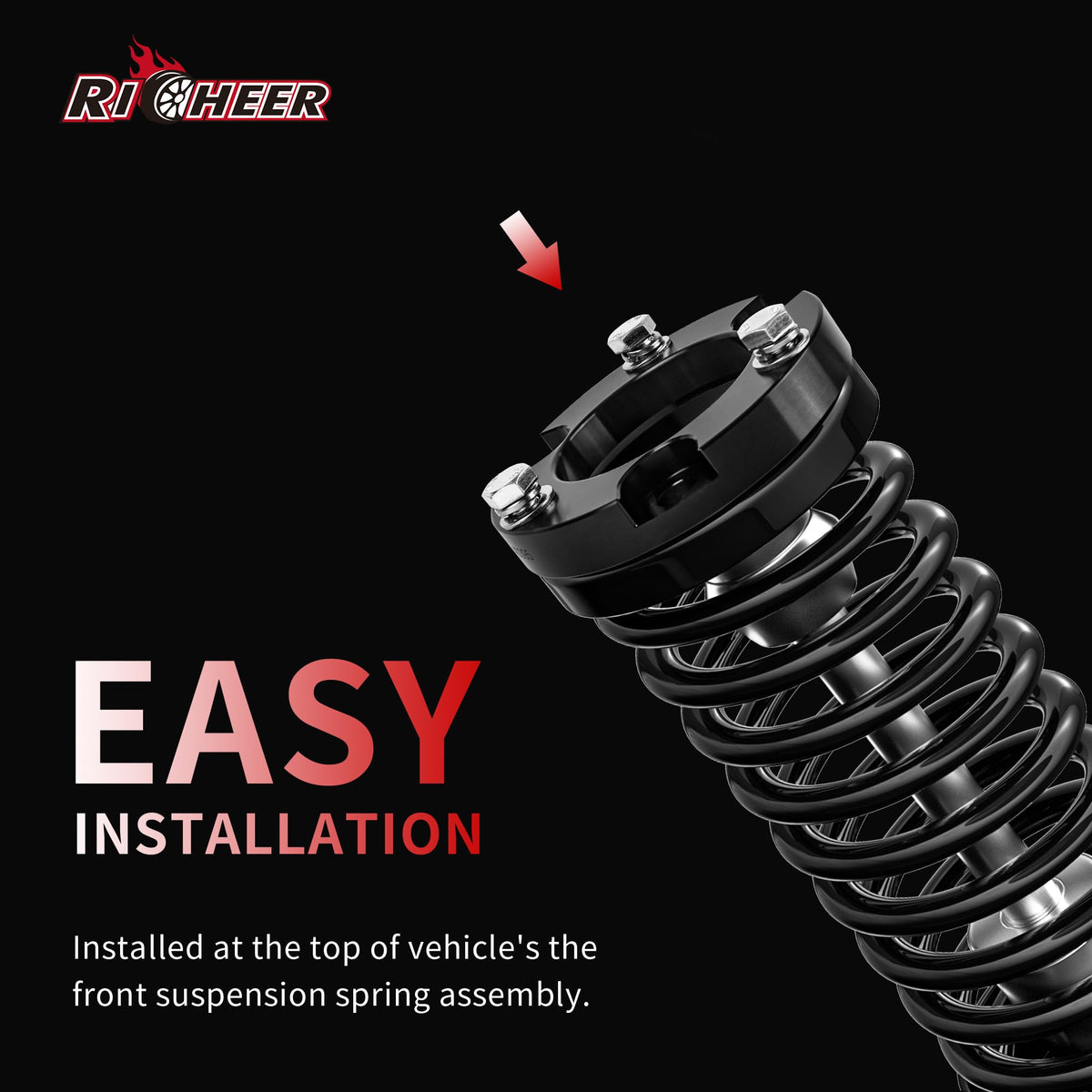 ??Compatible?2005-2023 TACOMA 4 RUNNER | ??Benefits?(1)CNC automatic processing ensure high accuracy and stability(0.02mm), Provide accurate hole position for easy installation (2)6061-T6 aluminum forged alloymaterial sturdy and durable (3)High quality pre-installed heat treated 12.9 grade studs | ??Function?The kit provides unparalleled ground clearance, Used to conquer off-road obstacles,And allow the installation of larger rims and tires. Make your truck look more aggressive | ??Easy Install?Installation can be completed within 1-2 hours, No cutting and drilling required and does not require strut/coil disassembly like other kits | ??Note?It will raise the front of your truck by 2 inch, bringing a perfect change in the appearance, performance and style of your truck. Because of suspension geometry,the ratio between lift height and kit thickness is not 1:1 | ?? Product Warranty ? All Richer products are covered by a 2-year warranty period, with no material or workmanship defects for a period of two years from the date of purchase.