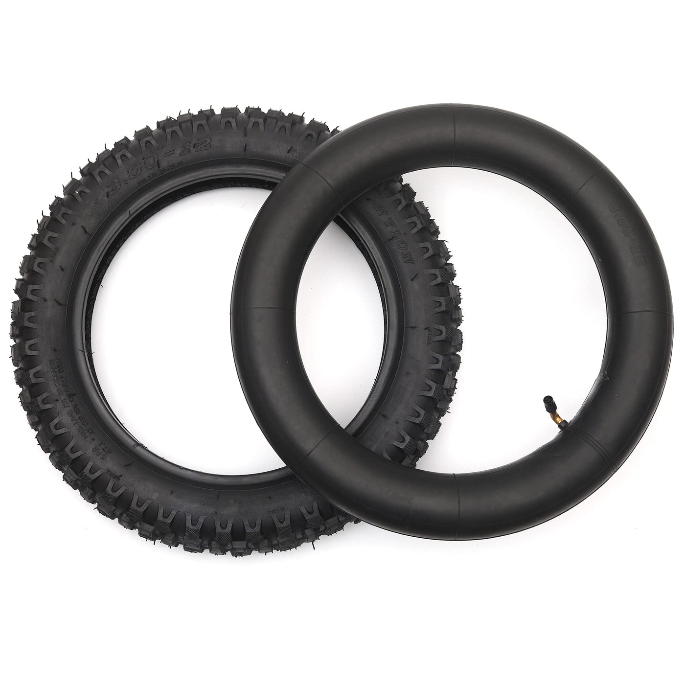 3.00-12 Dirt Bike Tire Key Features ?Fits 12-inch rims ?Made of premium-quality all-weather rubber and tread rubber compounds. ?Wear-resistant rubber with even tread wear ?Medium height knobby tread blocks for excellent all-terrain traction and handling even on wet and muddy terrain ?Evenly spaced open tread pattern is easy to clean and does not retain debris ?Minimal tread squirm and low rolling resistance ?Easy handling and suitable for both on-road and off-road use ?Suitable for both front and rear tire applications ?Compatible for use on motocross bikes, pit bikes, mini dirt bikes, and more ?4 PR sidewalls, 2 plies ?42 Load Rating with a max load capacity of 330 lbs ?J Speed Rating with a max speed of 62 mph 3.00/3.50-12 Dirt Bike Inner Tube Key Features ?Fits tires that are between 3 inches to 3.50 inches wide ?Made of premium-quality thick butyl rubber blend ?4x thicker and evenly molded for uniform inflation and excellent air retention ?Superior shock and vibration dampening properties with better elastic damping than natural rubber inner tubes ?HEAVY DUTY and self-sealing ?Will retain structural integrity even after repair and reinflation ?Weatherproof and can be stored for months without deteriorating ?Vulcanized TR87 angled valve stem easy access and inflation ?Round valve stem shape for rims with round valve stem bases