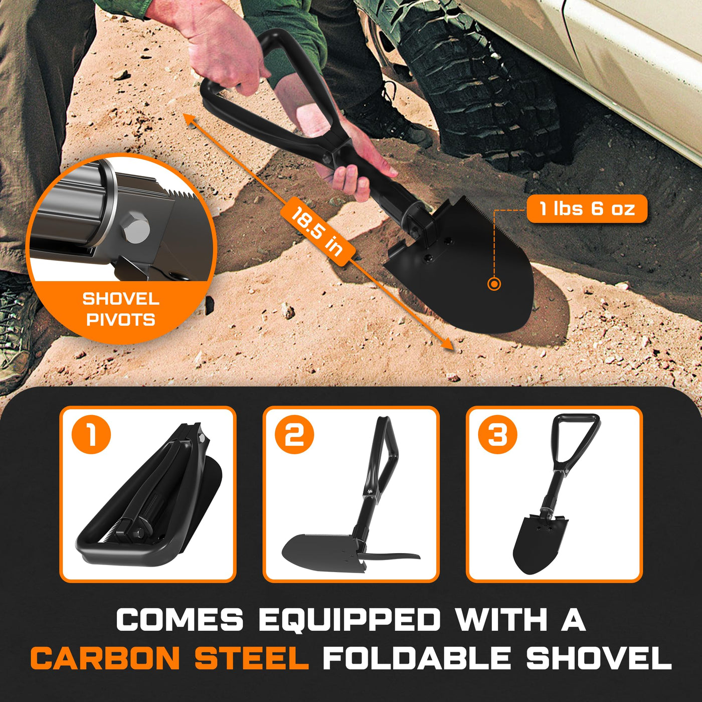 Equip yourself with the ultimate Car Recovery Kit from Optimise USA - a comprehensive set that ensures you're always ready to tackle any obstacle with ease and precision! Our ATV recovery rope is made from Nylon 66 and boasts a breaking strength of up to 48,500 lbs, making it perfect for recovering heavy trucks, UTVs, and SUVs. This 30-foot-soft rope provides ample length to position your vehicle and maneuver it safely out of mud, snow, or rocky terrain. And if that doesn't do the trick, our versatile foldable shovel will! Just unfold it, pivot it to your required angle, and use it either as a shovel or a pick-whatever the situation demands! When it's time for a recovery in dim light, watch our recovery ropes offroad kinetic light up the scene. The reflective strip glows, enhancing visibility and ensuring your safety during the recovery operation. Also, discover the two shackles for towing that are included in this set. Unlike traditional metal shackles that are heavy and inflexible, our shackles are crafted from UHMWPE material, making them lightweight and incredibly flexible. This design allows easy attachment to the D-ring of the stuck vehicle, ensuring a secure pull without worrying about the shackles coming loose. For all you off-roaders and overlanders, this is the ultimate off roading accessories you need. Pack everything up in its recovery kit bag and hit the road with spontaneity. Details:Recovery Rope: 1''x30''Shovel: 0.63kgX2 Soft Shackles: 7/16''x22'' At Optimise USA, we understand the call of the wild-the urge to push your vehicle to its limits and explore off the beaten path. That's why we've dedicated ourselves to crafting the finest recovery tow strap kit on the market, ensuring that nothing holds you back from your next great adventure. Turn challenges into triumphs with the Optimise USA Off Road Accessories For Trucks by clicking 'ADD TO CART' now!