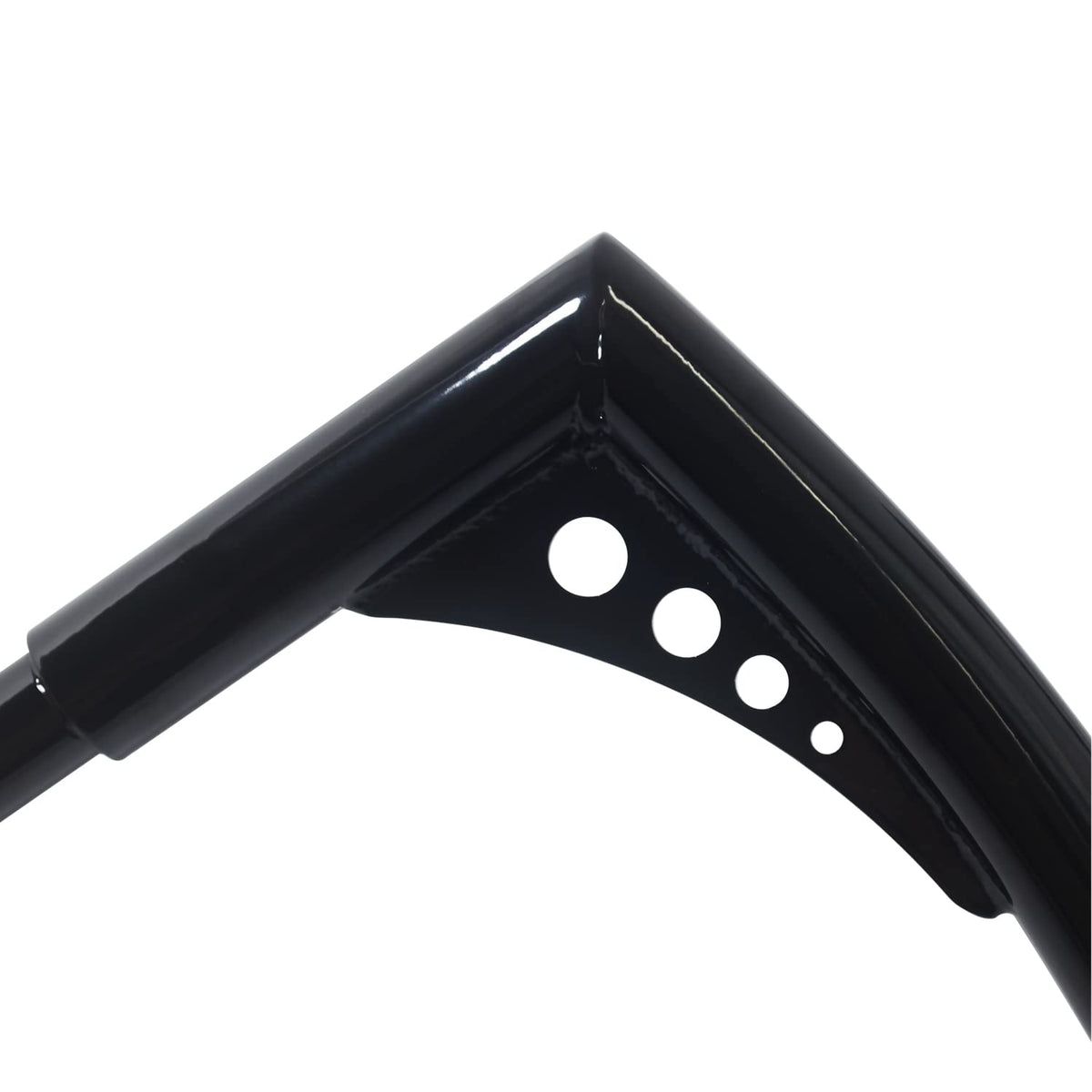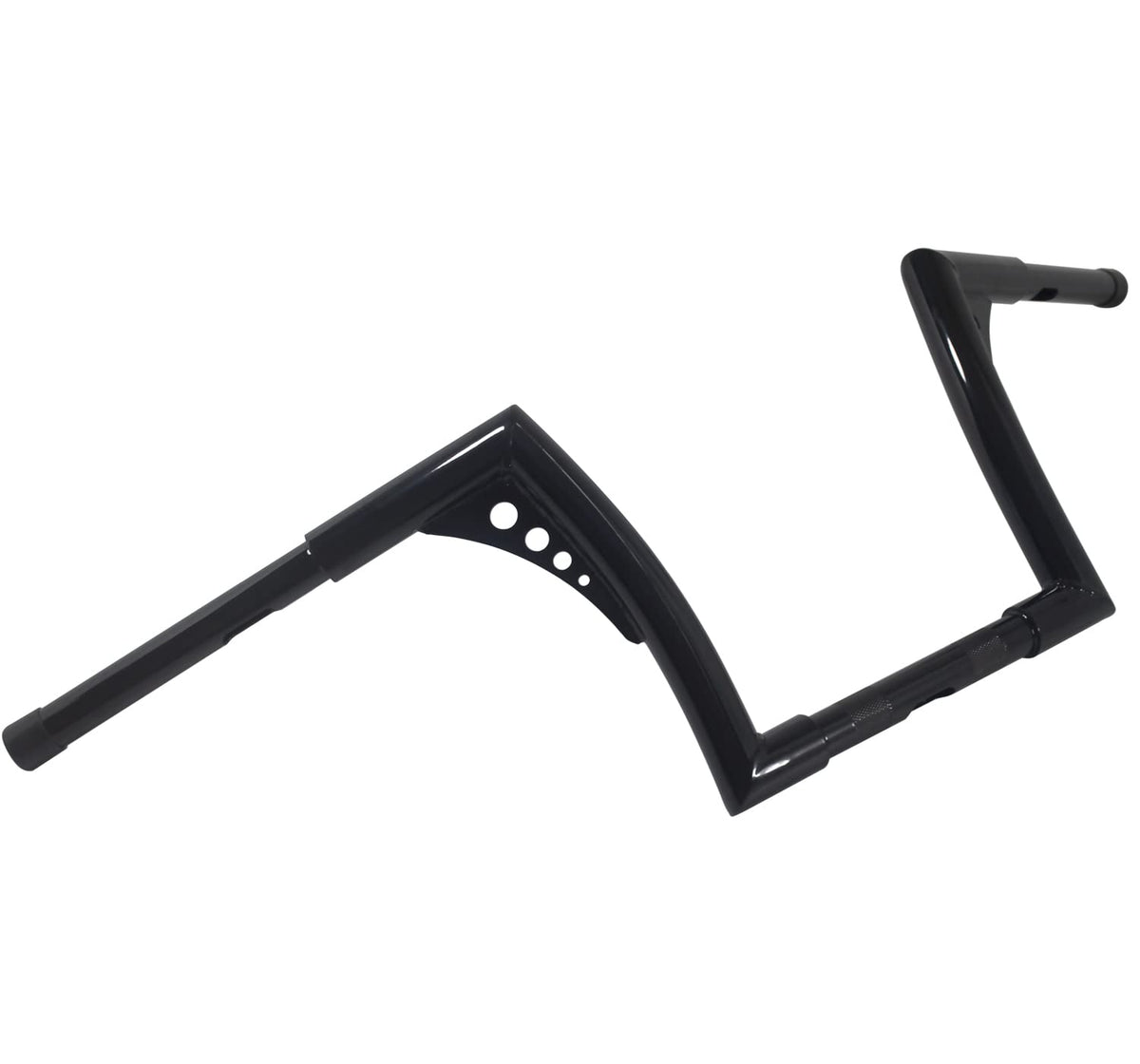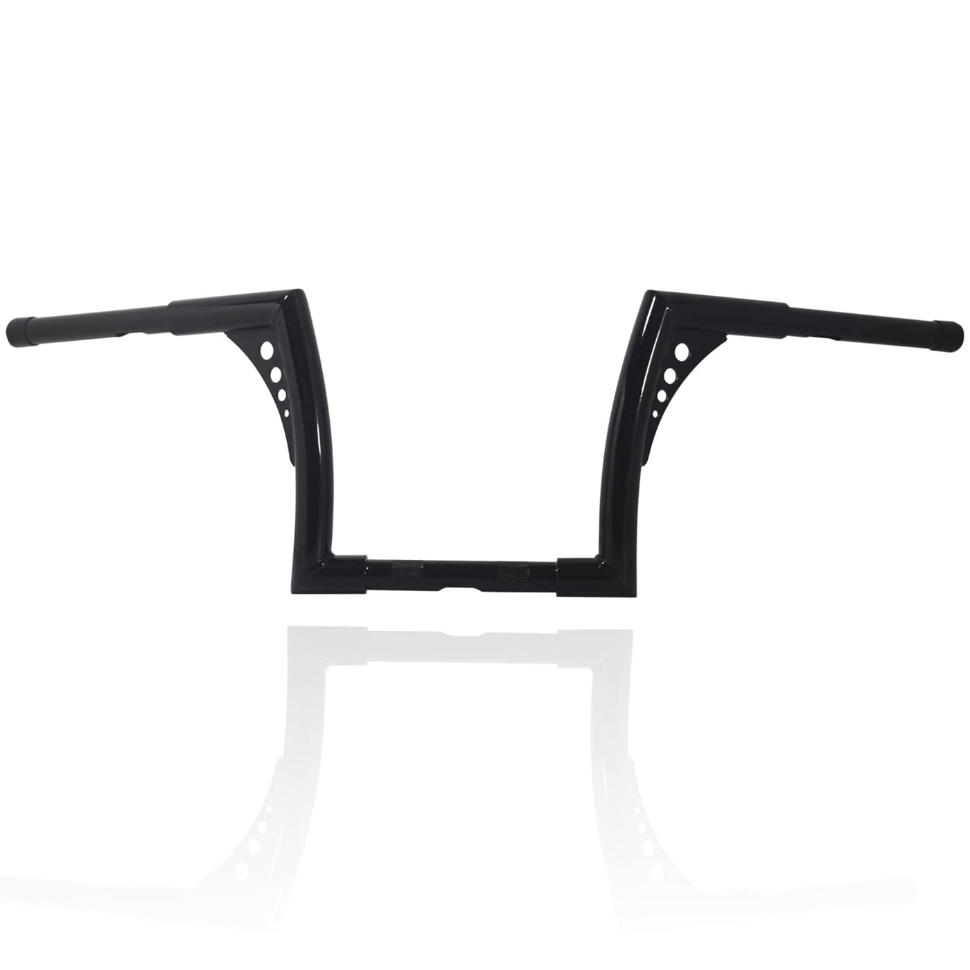 Q: What materials are used in the construction of these handlebars?A: The 10 Inch Rise Batwing Ape Hangers are constructed from high-strength alloy steel, ensuring durability and longevity. The surface is power-coated in gloss black for an attractive finish that also protects against the elements.