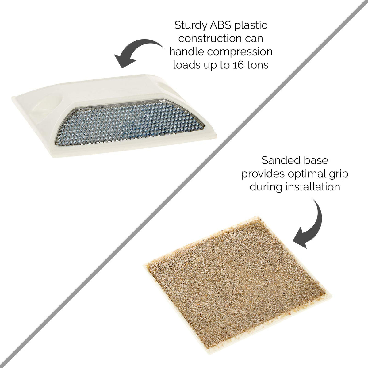 Q: What material are these road markers made from?A: These road markers are constructed from durable Acrylonitrile Butadiene Styrene (ABS) plastic, which is designed to withstand heavy loads and harsh weather conditions.