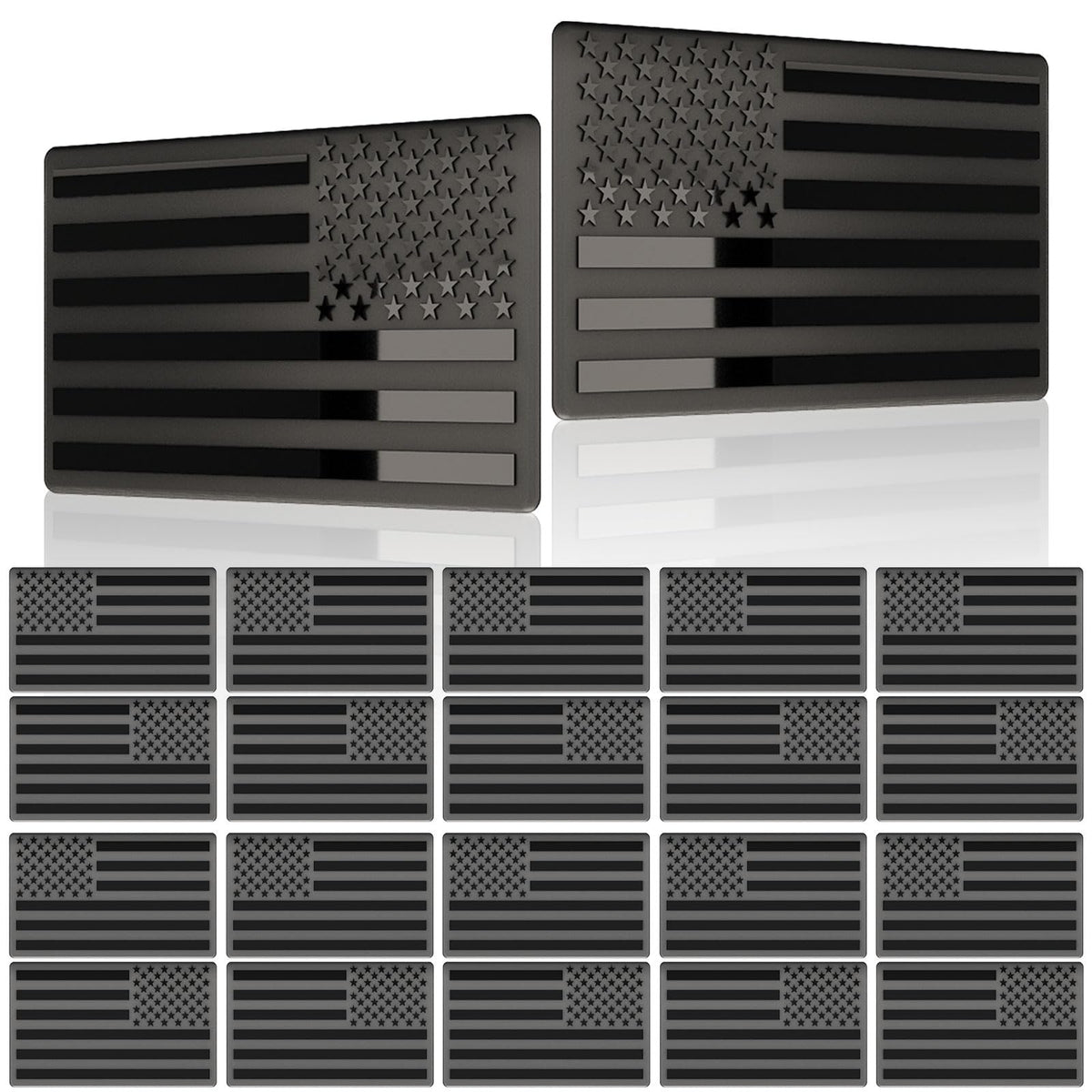 Package included: Each order Includes 10 pairs(20 pack) flag decals (10 pack USA Regular Orientation and 10 pack USA Reverse Orientation), each flag is 5 inches x 3 inches | Embossed 3D Flag: Made of High-Grade Aluminum alloy Material, Matte Black painted background. 3D designed Embossed Stars,Stripes and Matte Black Base makes it stand out and feel the craftsmanship | Strong Adhesive: Top Brand Double-sided tape on the back of emblem for better adhesion for durability. Please ensure the target surface clean and dry with cloth or tissue before applying | MADE TO LAST: Weatherproof, Sun-proof, UV fade resistant, it is designed to stick for a long time. | Widely Application: Used on cars,Golf cart, SUV, Tank,motorcycles,laptops, refrigerators, Show your patriotic love to our great USA and the statement that you will not surrender
