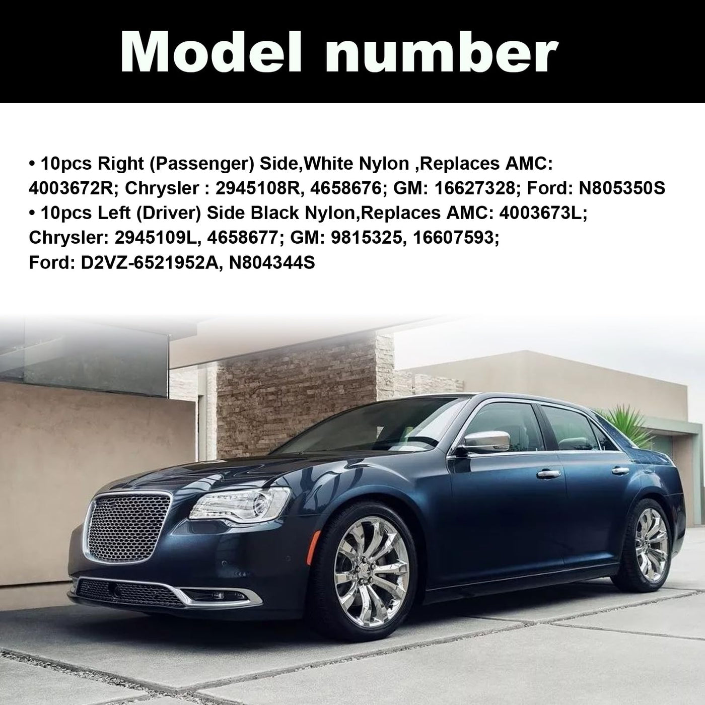 Q: How many pieces are included in the kit and what are the color options?A: The kit includes 10 pieces: 10 clips for the right (passenger) side in white and 10 clips for the left (driver) side in black.