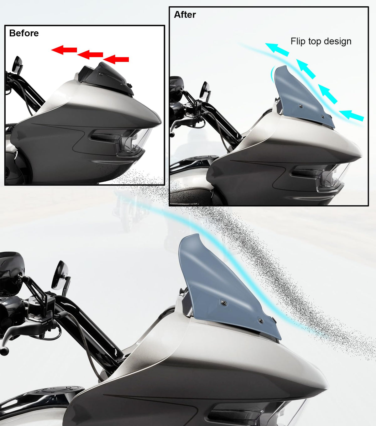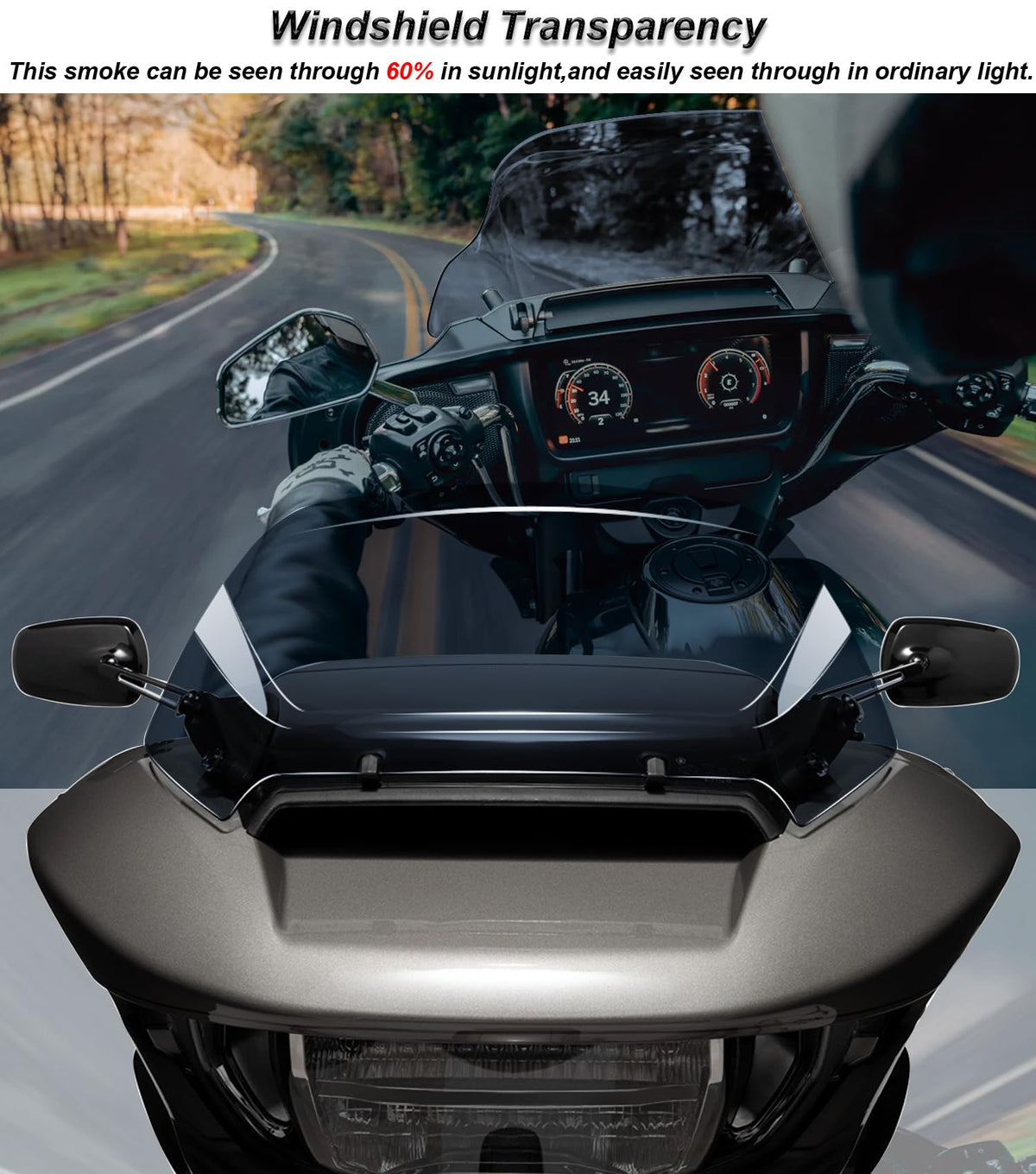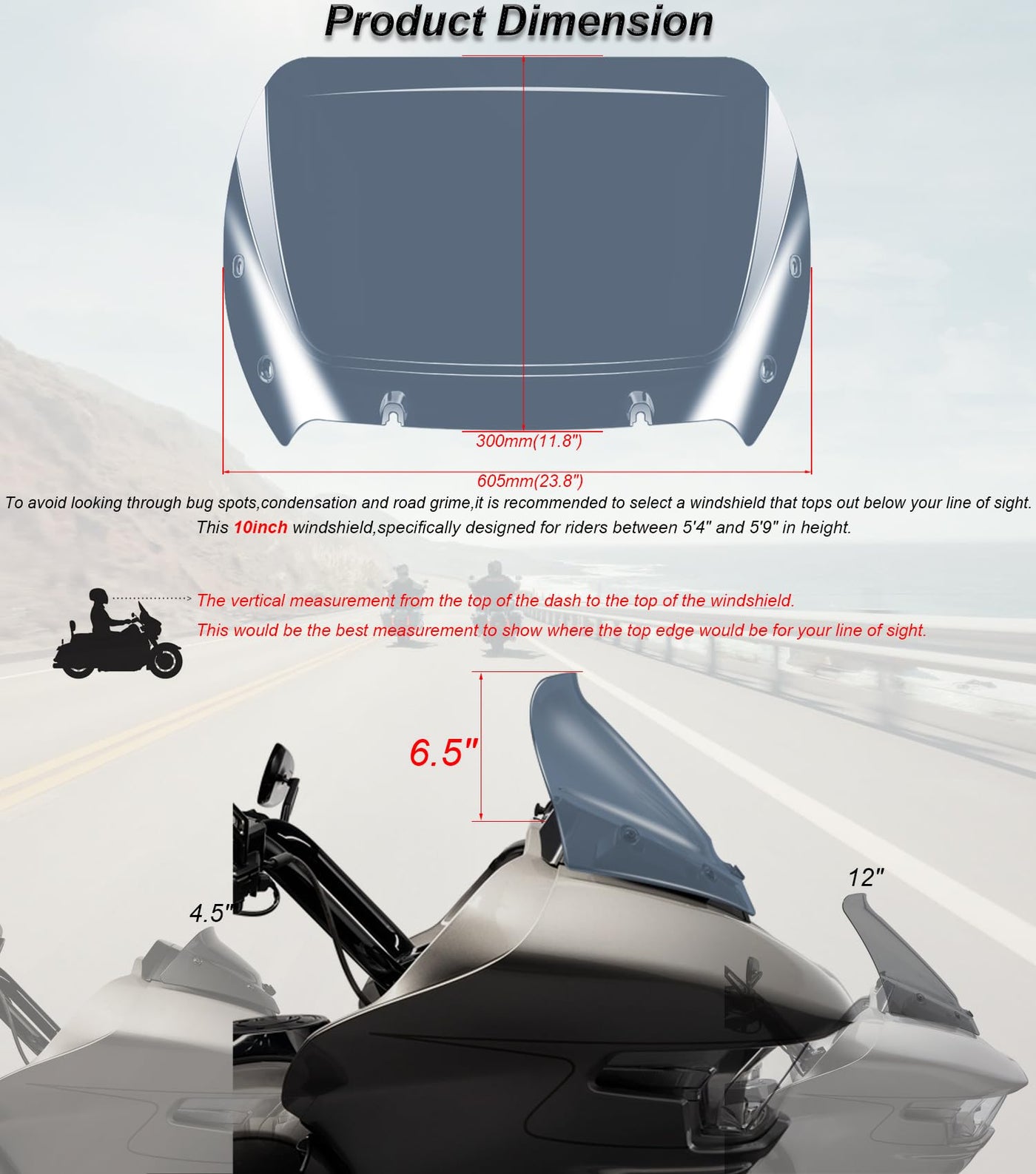 Features: The windshield can protect motorcycle enthusiasts from the wind,thrown-up rocks, debris, and bugs. It has solid hardware, so they are stable. Windscreen will deflect more wind for a more comfortable ride, and this makes a more relaxing and safe ride. 10-inch Windshield Specifically Designed for Riders Between 5'4'' and 5'9'' in Height. A Rider in this Range Will Experience up to 50% Reduction of Visor Pressure Over the Stock Windshield. Brand new,high quality. No need modification, predrilled holes. Easy to Install,Installation instructions not included. No screws Included. Windshield Type: Top Wave Designed. Windshield Height: The windshield height is 11.8-inch,then it will be 10-inch after installation. The vertical measurement from the top of the vent to the top of the windshield. Pleaes choose the right windshield. Color: As your choice. Material: Polycarbonate (PC). Packing: One Piece Windshield. Fitment: Fits for 2023-later CVO Road Glide FLTRXSE and 2024-later Road Glide FLTRX and CVO Road Glide ST FLTRXSTSE models. for CVO Road Glide ST FLTRXSTSE 2024-up for Road Glide FLTRX 2024-up for CVO Road Glide FLTRXSE 2023-up.