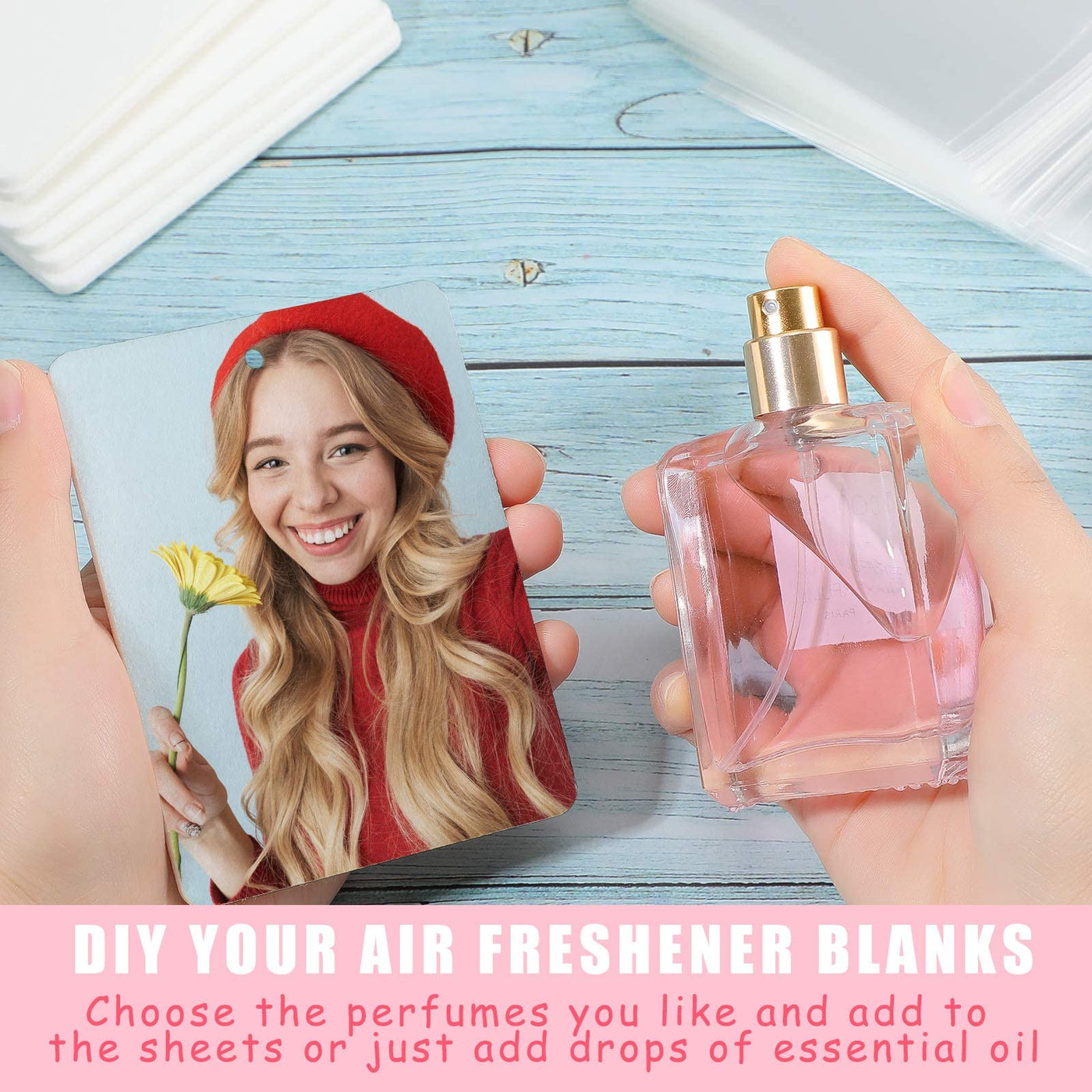 Q: How do I use the sublimation air freshener sheets?A: To use the sublimation air freshener sheets, simply add your favorite essential oils to the felt hanging sheet. Place the sheet into a packaging bag, then thread the elastic rope through the hole in the sheet and tie it in your desired location in your car or home.