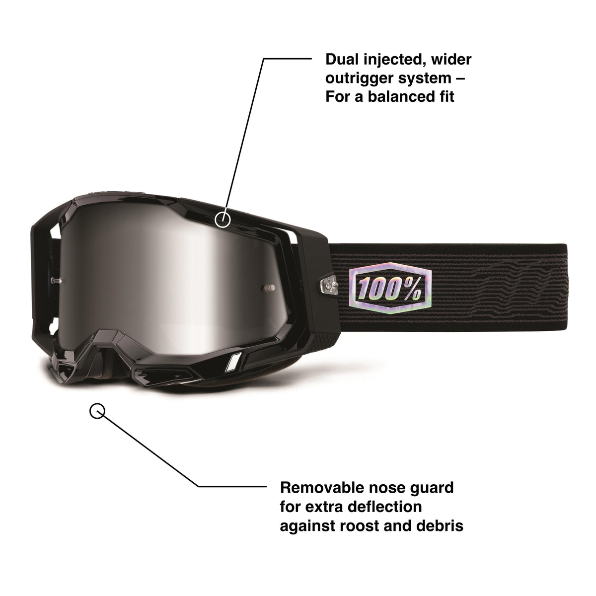 Q: What are the key features of the Racecraft 2 Mountain Bike & Motocross Goggles?A: The Racecraft 2 goggles feature improved fitment and seal with an increased field of view, dual injected wide outriggers for a balanced fit, triple-post tear-off support for secure fitment, ultra-thick triple-layer face foam to absorb sweat, and a 45mm wide silicone-coated strap for maximum grip.