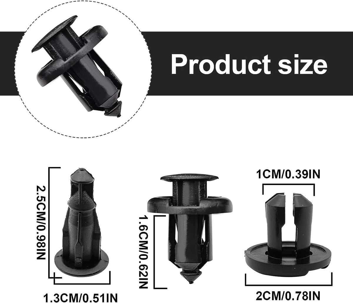 Q: What is the size of the Bumper Fender Clips?A: The Bumper Fender Clips have a stem length of 16 mm and a head diameter of 20 mm, designed to fit a 10 mm hole, making them an ideal replacement for old or damaged clips.