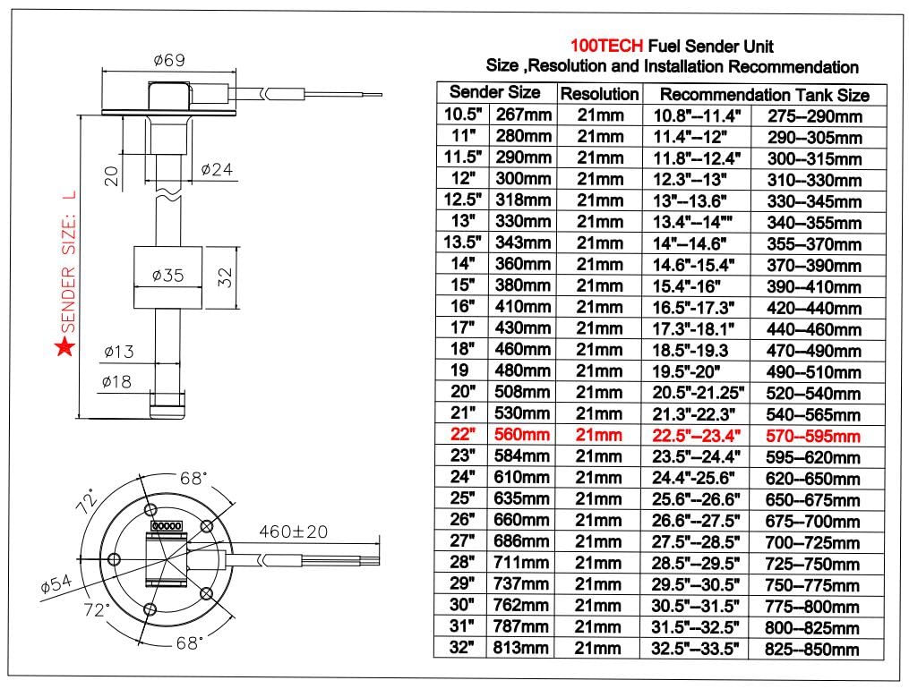 100TECH Reed Switch Fuel Sending Unit is Designed For the One Who Are looking for A Simple Solution To Measure The Amount of Fuel/Gasoline Level In The Tank. There are So many different Senders on Amazon, Whats The Features and Benefits of 100TECHs Sending Units ? 1. 100TECH Fuel Sender is Made With OKI Reed Switch(Imported from Japan),More Reliable and Durable. 2. The Resolution of 100TECH 4 ,5 ,5.5 ,6 ,7 ,7.5 Marine Fuel Sending Unit is 10mm. 3. The Rod, Cork Gasket and Mounting Screws of 100TECH Fuel Tank Sending Unit is Made From 316 Stainless Steel to Ensure Reliable Performance And Long Service Life. OThers: 1. The Resolution of Sender 4 ,5 ,5.5 ,6 ,7 ,7.5 Is 21mm. Lack of Resolution,The Dropping To Empty Is Very Steep, The Tank Looks 1/4 Full When It Is About At 1/8. 2. The Body of Sender is Made with 304 Stainless Steel. 304 rusts Faster As It Has Less Nickel And No Molybdenum. Operational Temperature: -40F ~ +85F (-40C ~ +85C). Additional Information : Package Information: 1 x 100TECH Fuel Sender 1 x Gasket 5 x M5*0.8 Length(16mm) Screws 1x Sending Unit Installation GuideNote: Please kindly pay Attention to the Product Description, Especially the Resolution and Length (the Length of Sender Should be 1'' less than the Depth of the Tank if tank is Plastic, and 0.5'' Less Than the Depth of the Tank if Tank is Metal) Before Placing the Order.