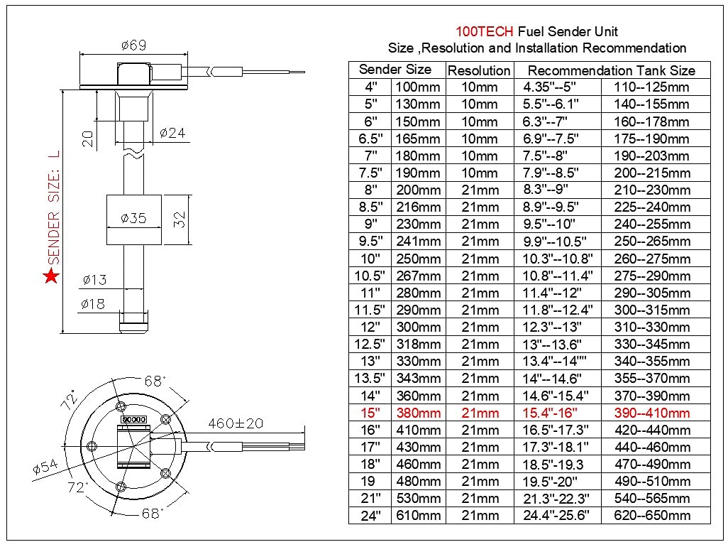 100TECH Stainless Steel Fule tank Sending Unit is Made With High quality Reed Switch. It's Easy to Install. A Perfect Match with All the Screw Holes Lining up the Unit Comes with 5pcs of Screws and 1pc of New Neoprene Gasket. It is the Direct Replacement for Arm Type Sensors or Original Wema Unit for Better Durability and Reliability. The Substantial Flange can Seal the Tank Completely The 100TECH Marine Fule Sending Units are Widely Used in Marine, On-road, Off-road, Generator set, and Industrial Applications. The Electric Liquid Level Sending Unit Utilizes Reed Switch and Magnetic Field technology. In 100TECH Reed Switch Level Senders the Float is the Only Moving Part of the Sender, Thereby Minimizing Potential Mechanical Failures. Material:Body: SUS 316 Stainless Steel. Cable: PVC. Float: NBR. Mounting Methods: Standard SAE 5 hole pattern. Protection Rank: IP67. Output Signal: 0-90 ohms (0 ohm at empty , 90 ohms at full). Resolution Range:10mm:5 ,6 ,7 ,21mm: 8 ,9 ,10 ,11 ,12 ,13 ,14 ,16 Operational Temperature: -40F ~ +85F (-40C ~ +85C). Package Information: 1 x 100TECH Fuel Sending Unit 1 x Gasket 5 x M5*0.8 Length(16mm) Screws 1x Sending Unit Installation Guide Note: Please kindly pay Attention to the Product Description, Especially the Resolution and Length (the Length of Sender Should be 1'' less than the Depth of the Tank if tank is Plastic, and 0.5'' Less Than the Depth of the Tank if Tank is Metal) Before Placing the Order.