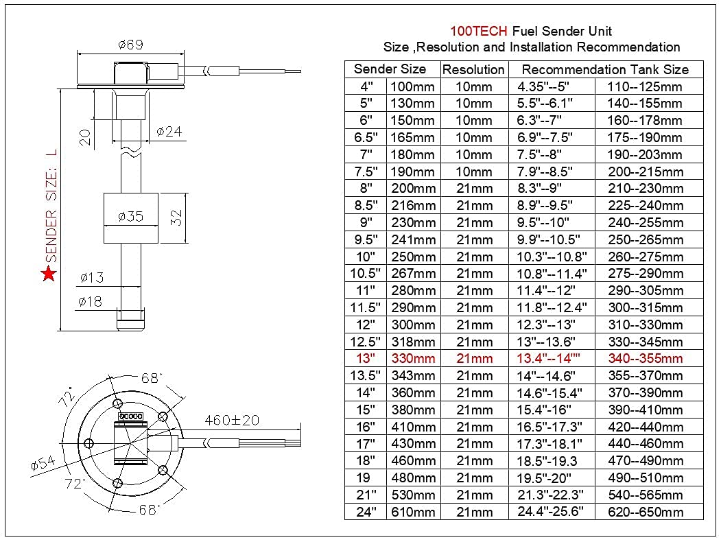 100TECH Stainless Steel Fule tank Sending Unit is Made With OKI Reed Switch(Imported from Japan). It's Easy to Install. A Perfect Match with All the Screw Holes Lining up the Unit Comes with 5pcs of Screws and 1pc of New Neoprene Gasket. It is the Direct Replacement for Arm Type Sensors or Original Wema Unit for Better Durability and Reliability. The Substantial Flange can Seal the Tank Completely The 100TECH Marine Fule Sending Units are Widely Used in Marine, On-road, Off-road, Generator set, and Industrial Applications. The Electric Liquid Level Sending Unit Utilizes Reed Switch and Magnetic Field technology. In 100TECH Reed Switch Level Senders the Float is the Only Moving Part of the Sender, Thereby Minimizing Potential Mechanical Failures. Material:Body: SUS 316 Stainless Steel. Cable: PVC. Float: NBR. Mounting Methods: Standard SAE 5 hole pattern. Protection Rank: IP67. Output Signal: American Standard 240-33 ohms (240 ohms at empty , 33 ohms at full). Resolution Range: 10mm: 4 ,5 ,6 ,7 21mm: 8 ,8.5 ,9 ,9.5 ,10 ,10.5 ,11 ,11.5 ,12 ,12.5 ,13 ,13.5 ,14 ,15 ,16 ,17 ,18 ,19 ,20 ,21 ,22 ,23 24 ,25 ,26 ,27 ,28 ,29 ,30 ,31 32 Operational Temperature: -40F ~ +85F (-40C ~ +85C). Package Information: 1 x 100TECH Fuel Sending Unit 1 x Gasket 5 x M5*0.8 Length(16mm) Screws 1x Sending Unit Installation Guide Note: Please kindly pay Attention to the Product Description, Especially the Resolution and Length (the Length of Sender Should be 1'' less than the Depth of the Tank if tank is Plastic, and 0.5'' Less Than the Depth of the Tank if Tank is Metal) Before Placing the Order.