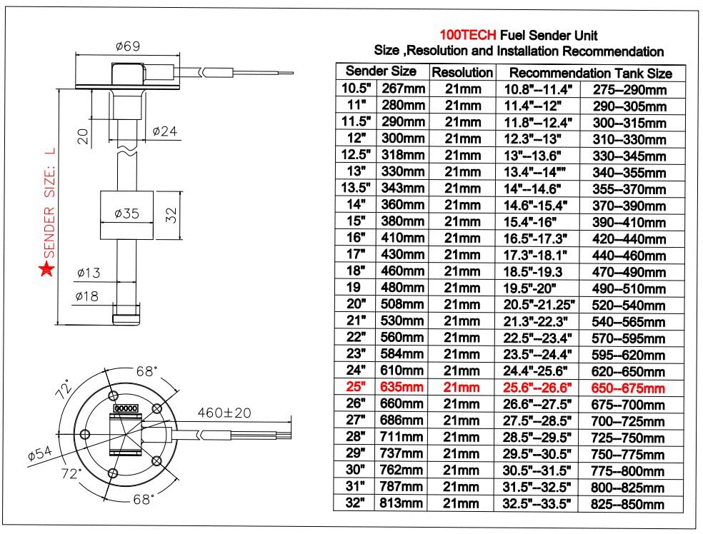 100TECH Stainless Steel Fule tank Sending Unit is Made With OKI Reed Switch(Imported from Japan). It's Easy to Install. A Perfect Match with All the Screw Holes Lining up the Unit Comes with 5pcs of Screws and 1pc of New Neoprene Gasket. It is the Direct Replacement for Arm Type Sensors or Original Wema Unit for Better Durability and Reliability. The Substantial Flange can Seal the Tank Completely The 100TECH Marine Fule Sending Units are Widely Used in Marine, On-road, Off-road, Generator set, and Industrial Applications. The Electric Liquid Level Sending Unit Utilizes Reed Switch and Magnetic Field technology. In 100TECH Reed Switch Level Senders the Float is the Only Moving Part of the Sender, Thereby Minimizing Potential Mechanical Failures. Material:Body: SUS 316 Stainless Steel. Cable: PVC. Float: NBR. Mounting Methods: Standard SAE 5 hole pattern. Protection Rank: IP65. Output Signal: American Standard 240-33 ohms (240 ohms at empty , 33 ohms at full). Resolution Range: 10mm: 4 ,5 ,6 ,6.5 7 ,7.5 21mm: 8 ,8.5 ,9 ,9.5 ,10 ,10.5 ,11 ,11.5 ,12 ,12.5 ,13 ,13.5 ,14 ,15 ,16 ,17 ,18 ,19 ,20 ,21 ,22 ,23 24 ,25 ,26 ,27 ,28 ,29 ,30 ,31 32 , Operational Temperature: -40F ~ +85F (-40C ~ +85C). Package Information: 1 x 100TECH Fuel Sending Unit 1 x Gasket 5 x M5*0.8 Length(16mm) Screws 1x Sending Unit Installation Guide Note: Please kindly pay Attention to the Product Description, Especially the Resolution and Length (the Length of Sender Should be 1'' less than the Depth of the Tank if tank is Plastic, and 0.5'' Less Than the Depth of the Tank if Tank is Metal) Before Placing the Order.