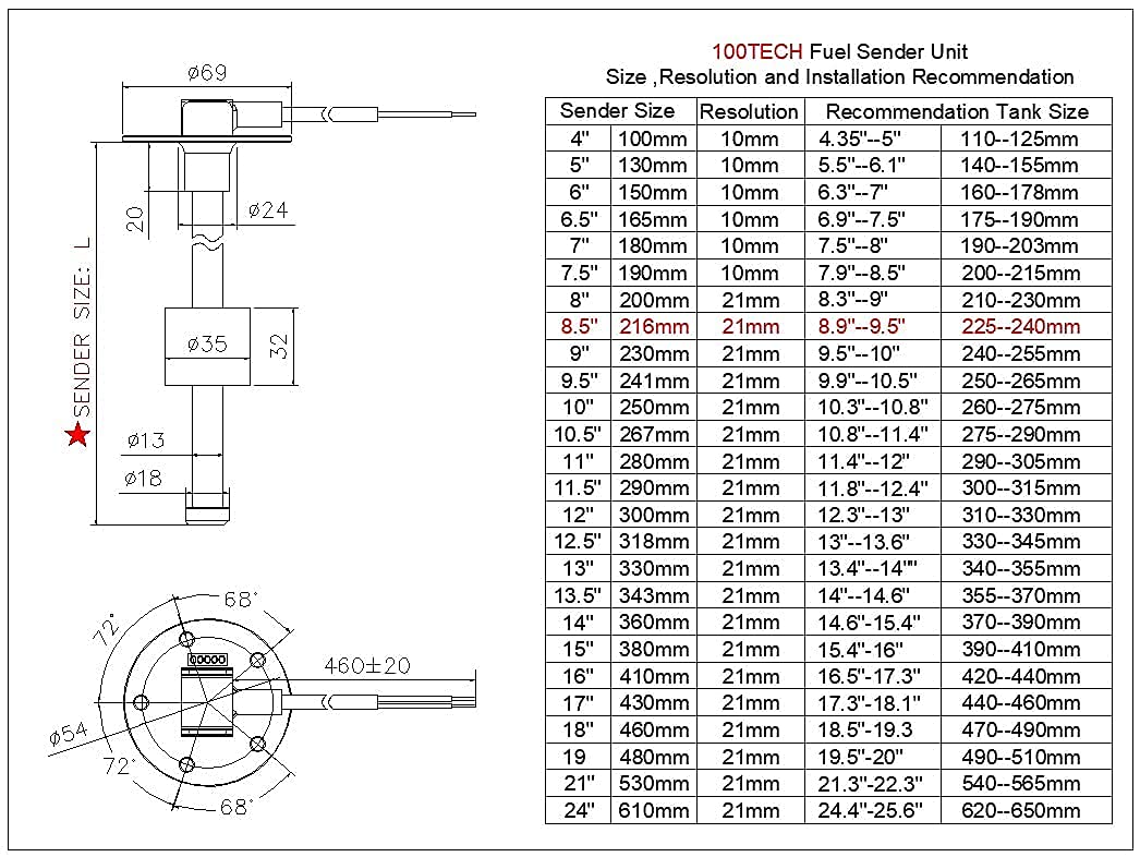 100TECH Stainless Steel Fule tank Sending Unit is Made With OKI Reed Switch(Imported from Japan). It's Easy to Install. A Perfect Match with All the Screw Holes Lining up the Unit Comes with 5pcs of Screws and 1pc of New Neoprene Gasket. It is the Direct Replacement for Arm Type Sensors or Original Wema Unit for Better Durability and Reliability. The Substantial Flange can Seal the Tank Completely The 100TECH Marine Fule Sending Units are Widely Used in Marine, On-road, Off-road, Generator set, and Industrial Applications. The Electric Liquid Level Sending Unit Utilizes Reed Switch and Magnetic Field technology. In 100TECH Reed Switch Level Senders the Float is the Only Moving Part of the Sender, Thereby Minimizing Potential Mechanical Failures. Material:Body: SUS 316 Stainless Steel. Cable: PVC. Float: NBR. Mounting Methods: Standard SAE 5 hole pattern. Protection Rank: IP65. Output Signal: American Standard 240-33 ohms (240 ohms at empty , 33 ohms at full). Resolution Range: 10mm: 4 ,5 ,6 ,6.5 ,7 ,7.5 21mm: 8 ,8.5 ,9 ,9.5 ,10 ,10.5 ,11 ,11.5 ,12 ,12.5 ,13 ,13.5 ,14 ,15 ,16 ,17 ,18 ,19 ,20 ,21 ,22 ,23 24 ,25 ,26 ,27 ,28 ,29 ,30 ,31 32 Operational Temperature: -40F ~ +85F (-40C ~ +85C). Package Information: 1 x 100TECH Fuel Sending Unit 1 x Gasket 5 x M5*0.8 Length(16mm) Screws 1x Sending Unit Installation Guide Note: Please kindly pay Attention to the Product Description, Especially the Resolution and Length (the Length of Sender Should be 1'' less than the Depth of the Tank if tank is Plastic, and 0.5'' Less Than the Depth of the Tank if Tank is Metal) Before Placing the Order.
