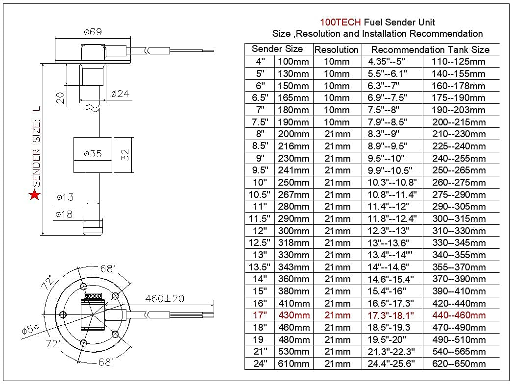 100TECH Stainless Steel Fule tank Sending Unit is Made With OKI Reed Switch(Imported from Japan). It's Easy to Install. A Perfect Match with All the Screw Holes Lining up the Unit Comes with 5pcs of Screws and 1pc of New Neoprene Gasket. It is the Direct Replacement for Arm Type Sensors or Original Wema Unit for Better Durability and Reliability. The Substantial Flange can Seal the Tank Completely The 100TECH Marine Fule Sending Units are Widely Used in Marine, On-road, Off-road, Generator set, and Industrial Applications. The Electric Liquid Level Sending Unit Utilizes Reed Switch and Magnetic Field technology. In 100TECH Reed Switch Level Senders the Float is the Only Moving Part of the Sender, Thereby Minimizing Potential Mechanical Failures. Material:Body: SUS 316 Stainless Steel. Cable: PVC. Float: NBR. Mounting Methods: Standard SAE 5 hole pattern. Protection Rank: IP67. Output Signal: American Standard 240-33 ohms (240 ohms at empty , 33 ohms at full). Resolution Range: 10mm: 4 ,5 ,6 ,6.5 ,7 ,7.5 21mm: 8 ,8.5 ,9 ,9.5 ,10 ,10.5 ,11 ,11.5 ,12 ,12.5 ,13 ,13.5 ,14 ,15 ,16 ,17 ,18 ,19 ,20 ,21 ,22 ,23 24 ,25 ,26 ,27 ,28 ,29 ,30 ,31 32 Operational Temperature: -40F ~ +85F (-40C ~ +85C). Package Information: 1 x 100TECH Fuel Sending Unit 1 x Gasket 5 x M5*0.8 Length(16mm) Screws 1x Sending Unit Installation Guide Note: Please kindly pay Attention to the Product Description, Especially the Resolution and Length (the Length of Sender Should be 1'' less than the Depth of the Tank if tank is Plastic, and 0.5'' Less Than the Depth of the Tank if Tank is Metal) Before Placing the Order.