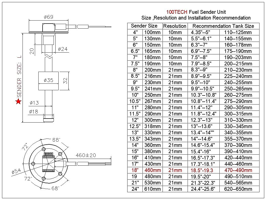 100TECH Stainless Steel Fule tank Sending Unit is Made With OKI Reed Switch(Imported from Japan). It's Easy to Install. A Perfect Match with All the Screw Holes Lining up the Unit Comes with 5pcs of Screws and 1pc of New Neoprene Gasket. It is the Direct Replacement for Arm Type Sensors or Original Wema Unit for Better Durability and Reliability. The Substantial Flange can Seal the Tank Completely The 100TECH Marine Fule Sending Units are Widely Used in Marine, On-road, Off-road, Generator set, and Industrial Applications. The Electric Liquid Level Sending Unit Utilizes Reed Switch and Magnetic Field technology. In 100TECH Reed Switch Level Senders the Float is the Only Moving Part of the Sender, Thereby Minimizing Potential Mechanical Failures. Material:Body: SUS 316 Stainless Steel. Cable: PVC. Float: NBR. Mounting Methods: Standard SAE 5 hole pattern. Protection Rank: IP65. Output Signal: American Standard 240-33 ohms (240 ohms at empty , 33 ohms at full). Resolution Range: 10mm: 4 ,5 ,6 ,6.5 ,7 ,7.5 21mm: 8 ,8.5 ,9 ,9.5 ,10 ,10.5 ,11 ,11.5 ,12 ,12.5 ,13 ,13.5 ,14 ,15 ,16 ,17 ,18 ,19 ,20 ,21 ,22 ,23 24 ,25 ,26 ,27 ,28 ,29 ,30 ,31 32 Operational Temperature: -40F ~ +85F (-40C ~ +85C). Package Information: 1 x 100TECH Fuel Sending Unit 1 x Gasket 5 x M5*0.8 Length(16mm) Screws 1x Sending Unit Installation Guide Note: Please kindly pay Attention to the Product Description, Especially the Resolution and Length (the Length of Sender Should be 1'' less than the Depth of the Tank if tank is Plastic, and 0.5'' Less Than the Depth of the Tank if Tank is Metal) Before Placing the Order.