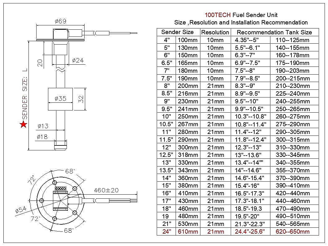 100TECH Stainless Steel Fule tank Sending Unit is Made With OKI Reed Switch(Imported from Japan). It's Easy to Install. A Perfect Match with All the Screw Holes Lining up the Unit Comes with 5pcs of Screws and 1pc of New Neoprene Gasket. It is the Direct Replacement for Arm Type Sensors or Original Wema Unit for Better Durability and Reliability. The Substantial Flange can Seal the Tank Completely The 100TECH Marine Fule Sending Units are Widely Used in Marine, On-road, Off-road, Generator set, and Industrial Applications. The Electric Liquid Level Sending Unit Utilizes Reed Switch and Magnetic Field technology. In 100TECH Reed Switch Level Senders the Float is the Only Moving Part of the Sender, Thereby Minimizing Potential Mechanical Failures. Material:Body: SUS 316 Stainless Steel. Cable: PVC. Float: NBR. Mounting Methods: Standard SAE 5 hole pattern. Protection Rank: IP65. Output Signal: American Standard 240-33 ohms (240 ohms at empty , 33 ohms at full). Resolution Range: 10mm: 4 ,5 ,6 ,6.5 ,7 ,7.5 21mm: 8 ,8.5 9 ,9.5 ,10 ,10.5 ,11 ,11.5 ,12 ,12.5 ,13 ,13.5 ,14 ,15 ,16 ,17 ,18 ,19 ,21 ,24 Operational Temperature: -40F ~ +85F (-40C ~ +85C). Package Information: 1 x 100TECH Fuel Sending Unit 1 x Gasket 5 x M5*0.8 Length(16mm) Screws 1x Sending Unit Installation Guide Note: Please kindly pay Attention to the Product Description, Especially the Resolution and Length (the Length of Sender Should be 1'' less than the Depth of the Tank if tank is Plastic, and 0.5'' Less Than the Depth of the Tank if Tank is Metal) Before Placing the Order.