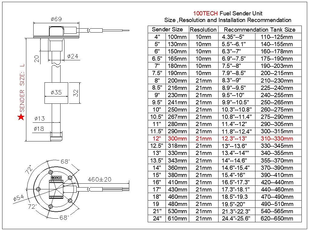 100TECH Stainless Steel Fule tank Sending Unit is Made With High quality Reed Switch. It's Easy to Install. A Perfect Match with All the Screw Holes Lining up the Unit Comes with 5pcs of Screws and 1pc of New Neoprene Gasket. It is the Direct Replacement for Arm Type Sensors or Original Wema Unit for Better Durability and Reliability. The Substantial Flange can Seal the Tank Completely The 100TECH Marine Fule Sending Units are Widely Used in Marine, On-road, Off-road, Generator set, and Industrial Applications. The Electric Liquid Level Sending Unit Utilizes Reed Switch and Magnetic Field technology. In 100TECH Reed Switch Level Senders the Float is the Only Moving Part of the Sender, Thereby Minimizing Potential Mechanical Failures. Material:Body: SUS 316 Stainless Steel. Cable: PVC. Float: NBR. Mounting Methods: Standard SAE 5 hole pattern. Protection Rank: IP67. Output Signal: 0-90 ohms (0 ohm at empty , 90 ohms at full). Resolution Range:10mm:5 ,6 ,7 ,21mm: 8 ,9 ,10 ,11 ,12 ,13 ,14 ,16 Operational Temperature: -40F ~ +85F (-40C ~ +85C). Package Information: 1 x 100TECH Fuel Sending Unit 1 x Gasket 5 x M5*0.8 Length(16mm) Screws 1x Sending Unit Installation Guide Note: Please kindly pay Attention to the Product Description, Especially the Resolution and Length (the Length of Sender Should be 1'' less than the Depth of the Tank if tank is Plastic, and 0.5'' Less Than the Depth of the Tank if Tank is Metal) Before Placing the Order.