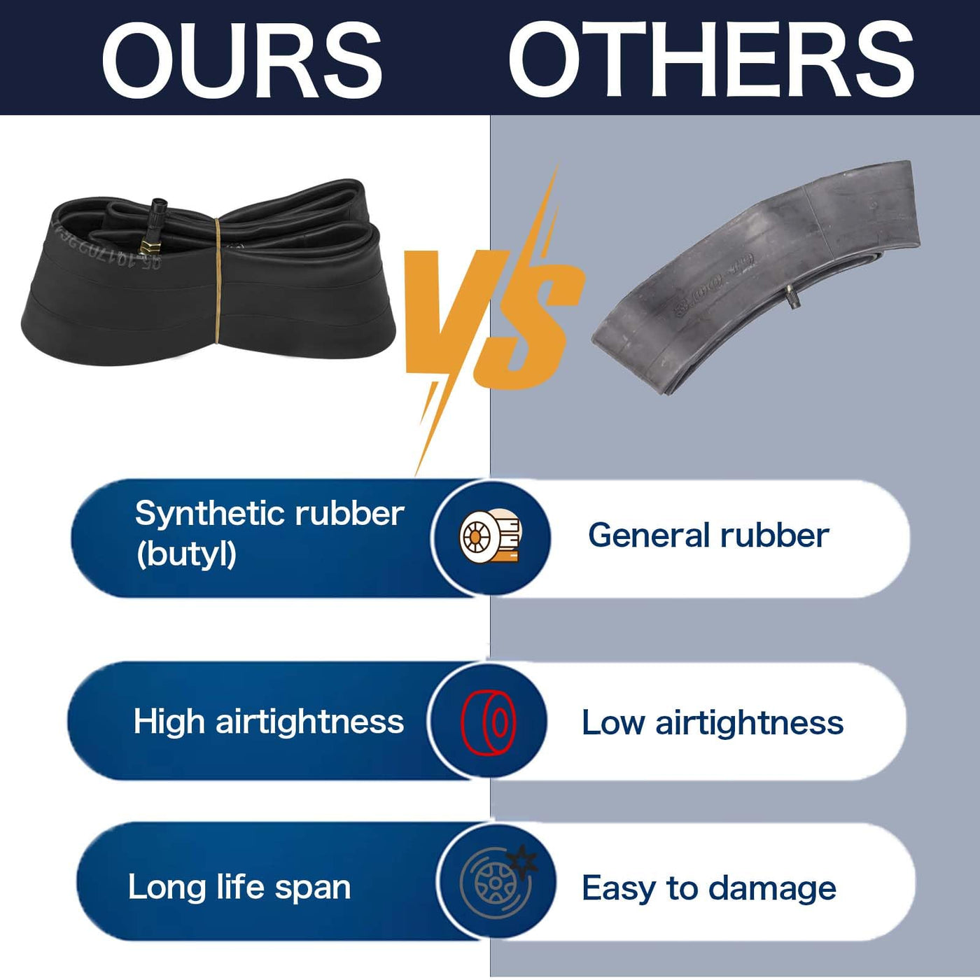 Q: What material are the inner tubes made from?A: The inner tubes are crafted from 3mm thick butyl rubber, which offers superior shock absorption and helps maintain optimal tire pressure.