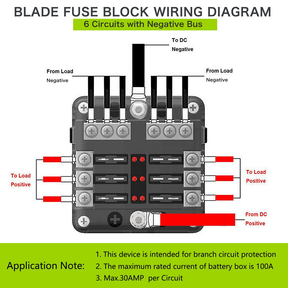 12 Volt Fuse Block, Waterproof 6 Way Fuse Box With 6 Ground Negative Busbar For Automotive[100 Amp Max] [Led Indicator] For Car Golf Cart Boat Marine Rv Dc 12-24V