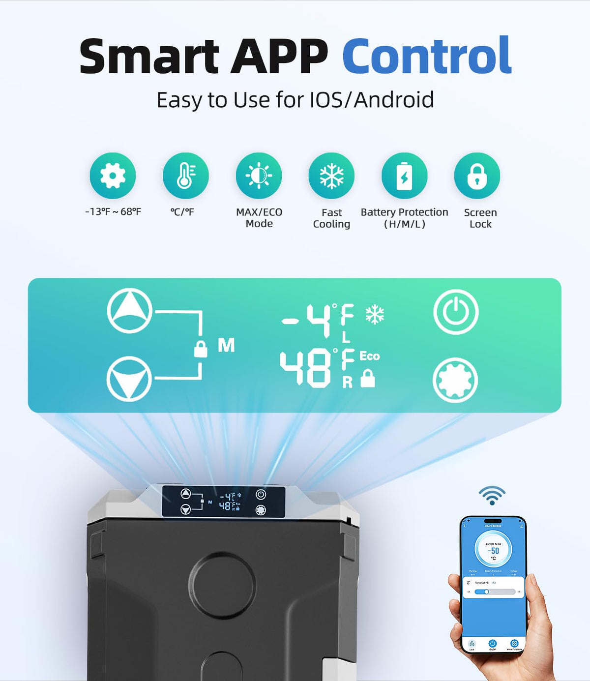 12 Volt Refrigerator, 53QT(50L) Compressor Electric Cooler with Wheels, Car Fridge with APP Control, Portable Freezer -13?~68?,