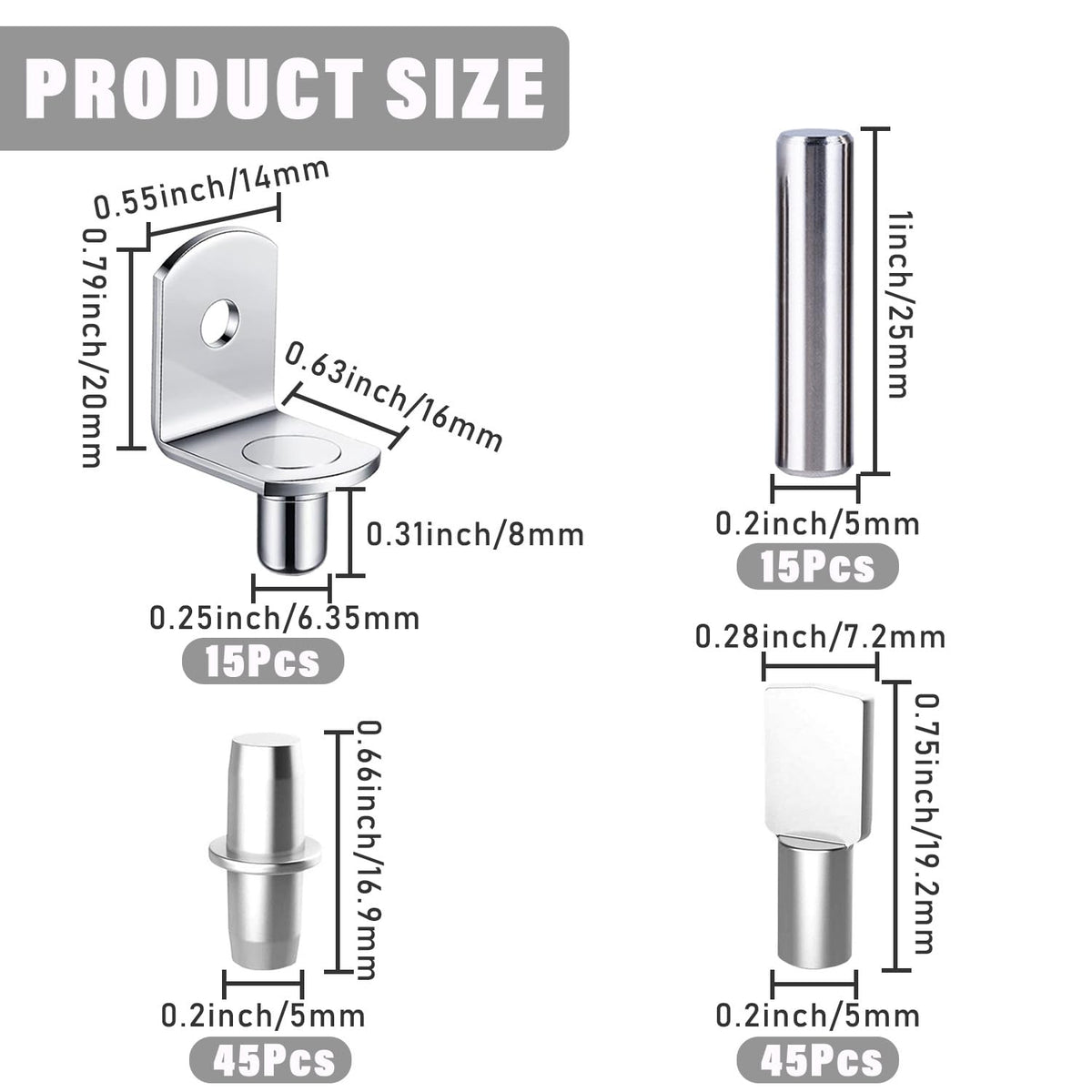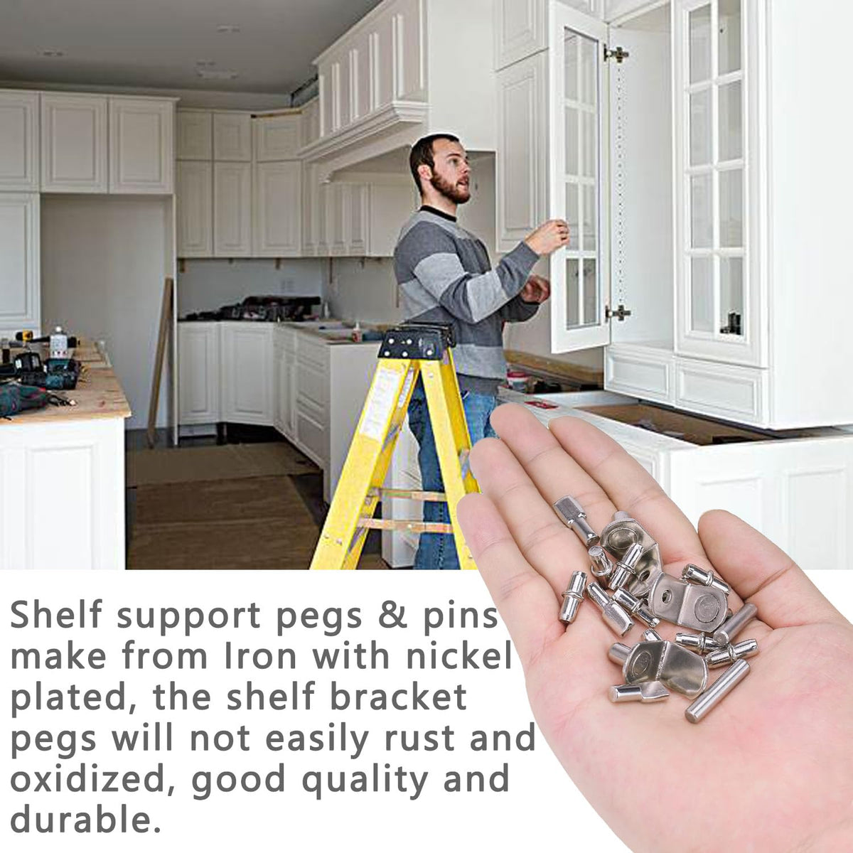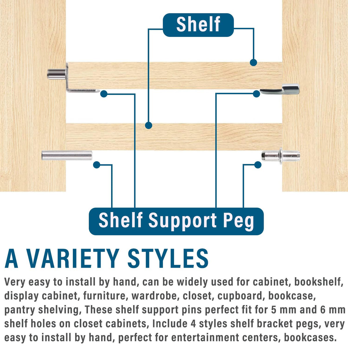 ?Pack of 120?Our shelf pegs & pins kit includes 120 Pcs 4 styles of shelf bracket pegs: 15pcs L-shaped support pins with hole, 15pcs dowel pins, 45pcs flat spoon bookcase shelf pegs, 45pcs cylindrical shaped cabinet pins, which will meet your demands on various projects.