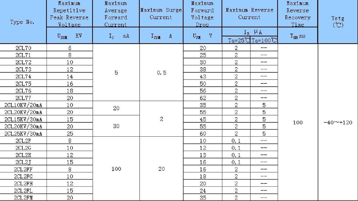 Q: What is the maximum voltage and current rating for the 2CL2FL diodes?A: The 2CL2FL diodes can handle a repetitive peak reverse voltage of 15KV and an average forward current of 100mA, making them suitable for high voltage applications.